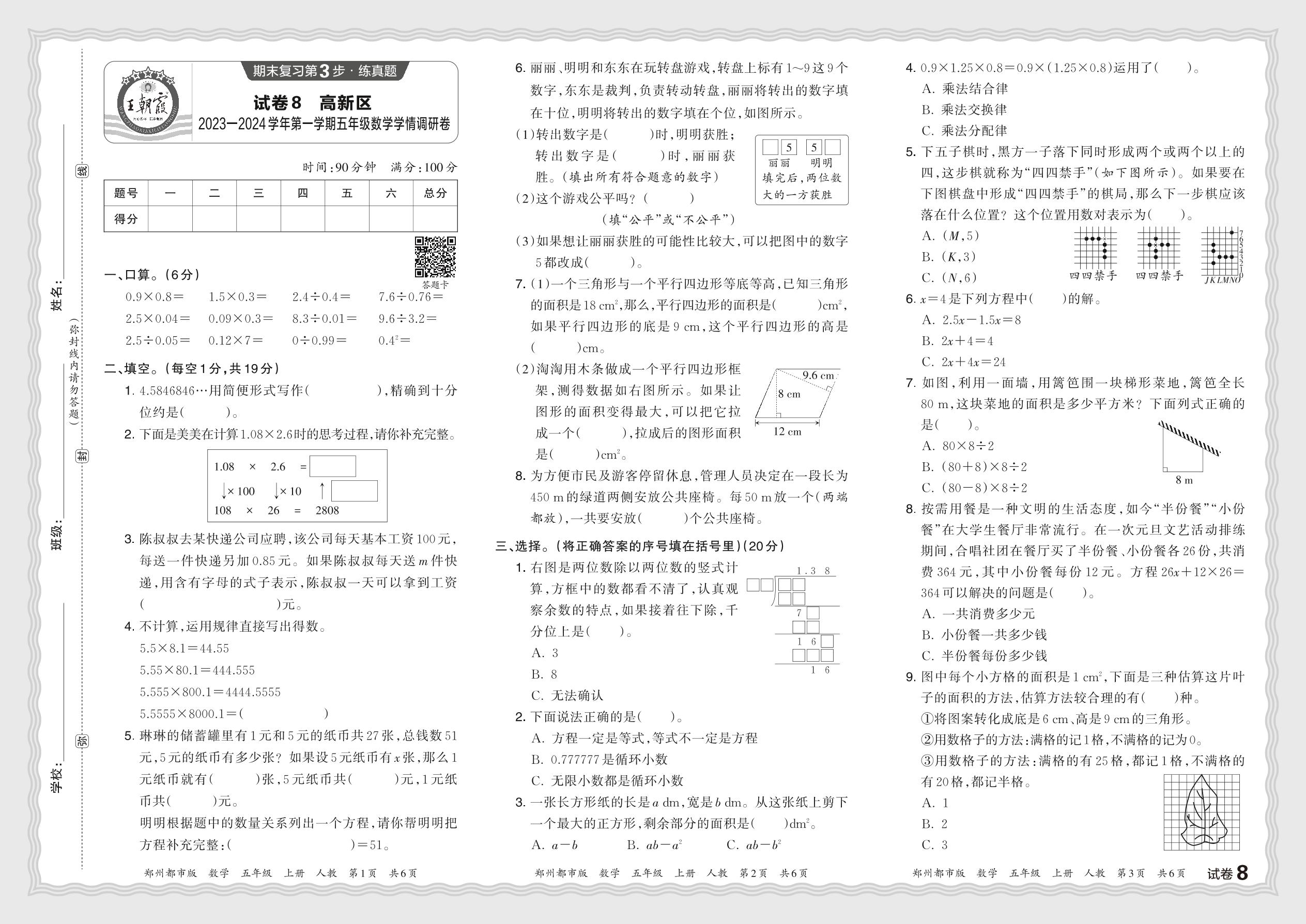 河南省郑州市高新区2023—2024学年第一学期五年级数学学情调研卷(人教版)【8】