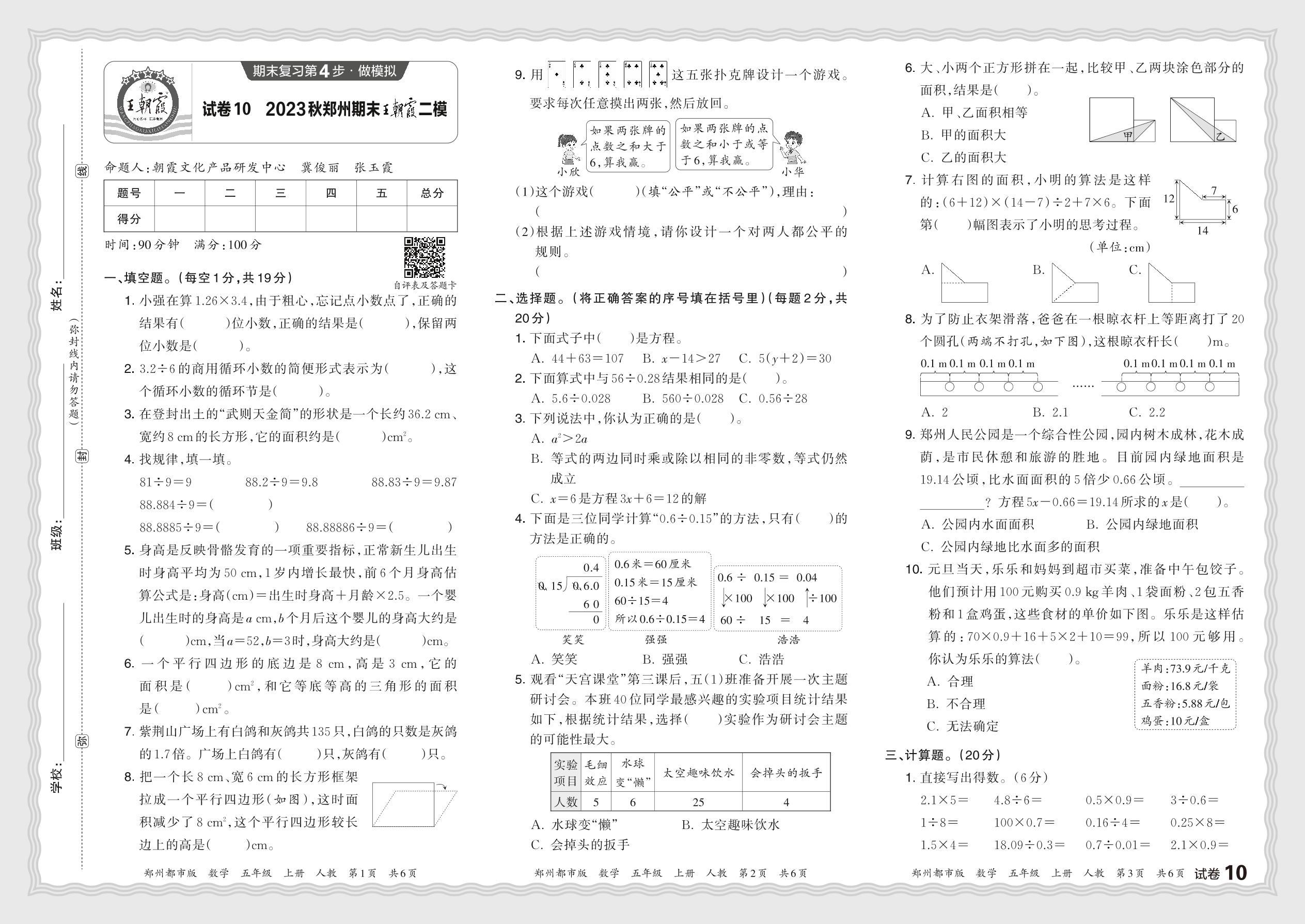 2023秋上册五年级数学人教版 河南郑州期末王朝霞二模【10】