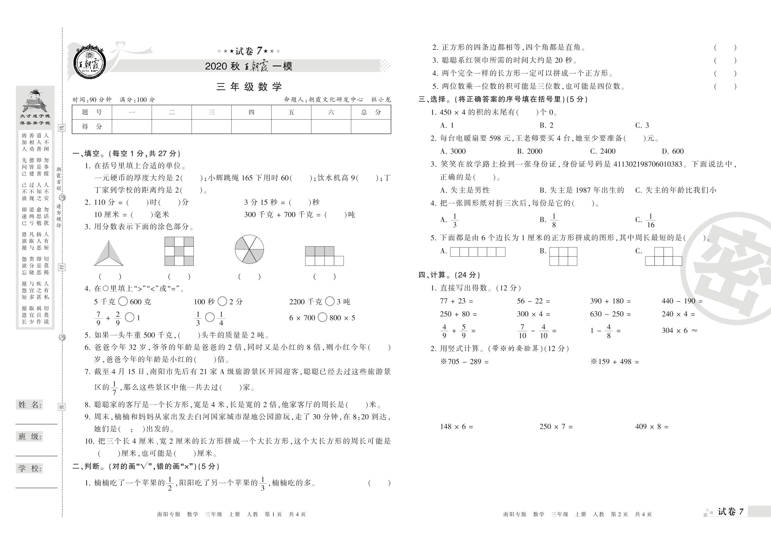 王朝霞期末模拟卷三年级上册数学(人教版)_R21080490955【7】