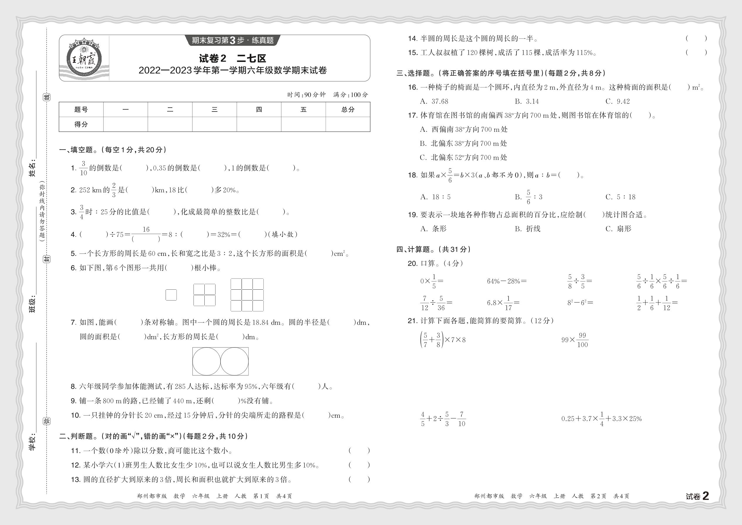河南省郑州市二七区2022—2023学年第一学期六年级数学期末试卷(人教版)【2】