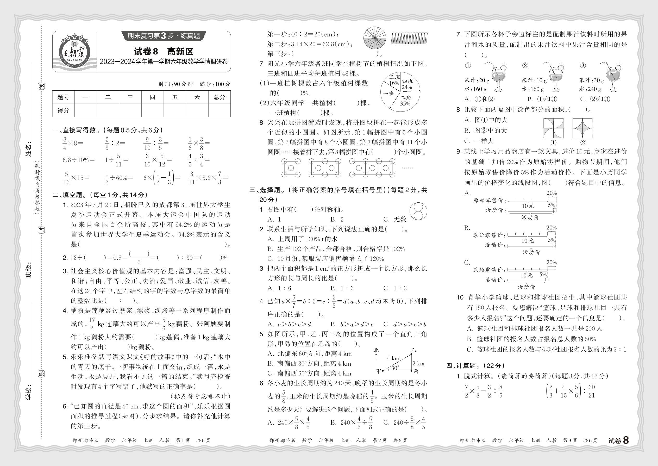 河南省郑州市高新区2023—2024学年第一学期六年级数学学情调研卷(人教版)【8】