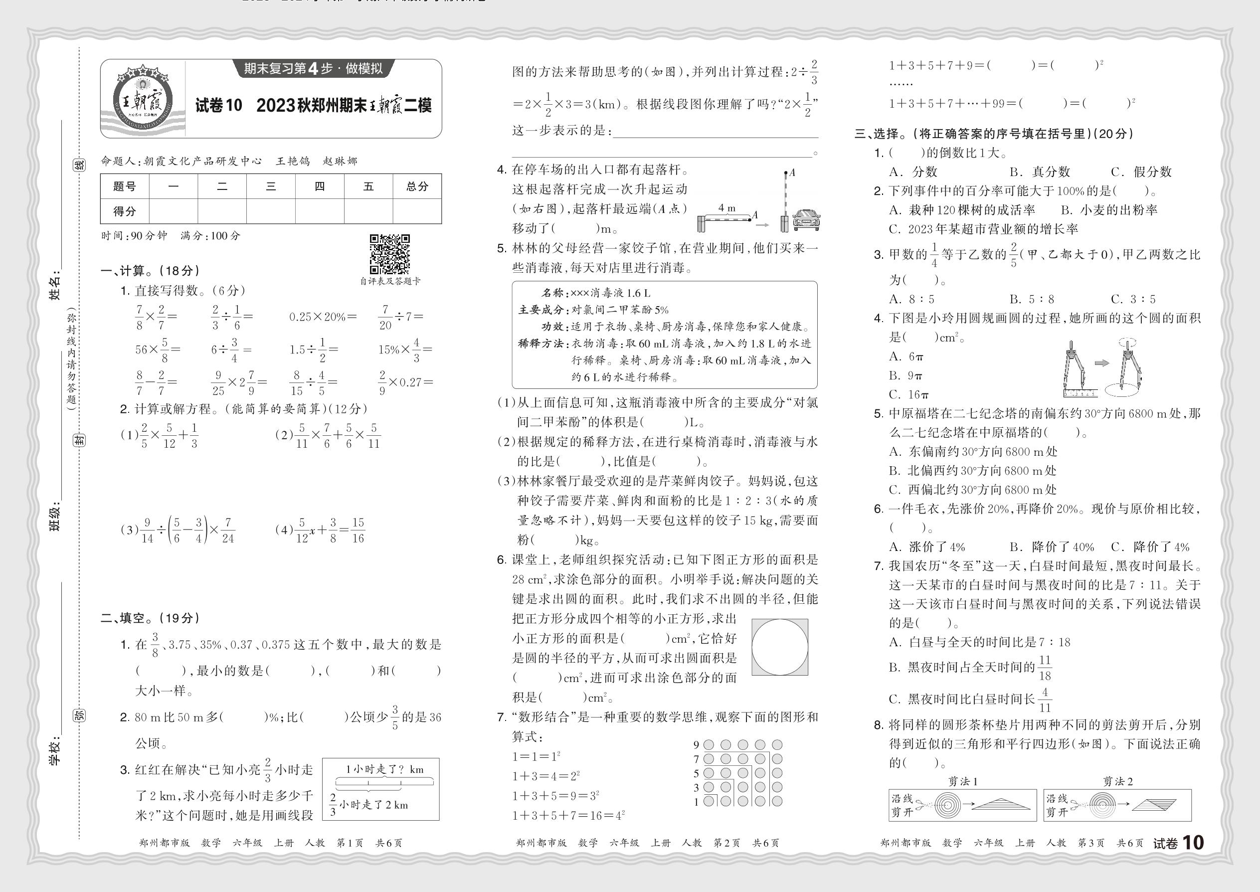 2023秋上册六年级数学人教版 河南郑州期末王朝霞二模【10】