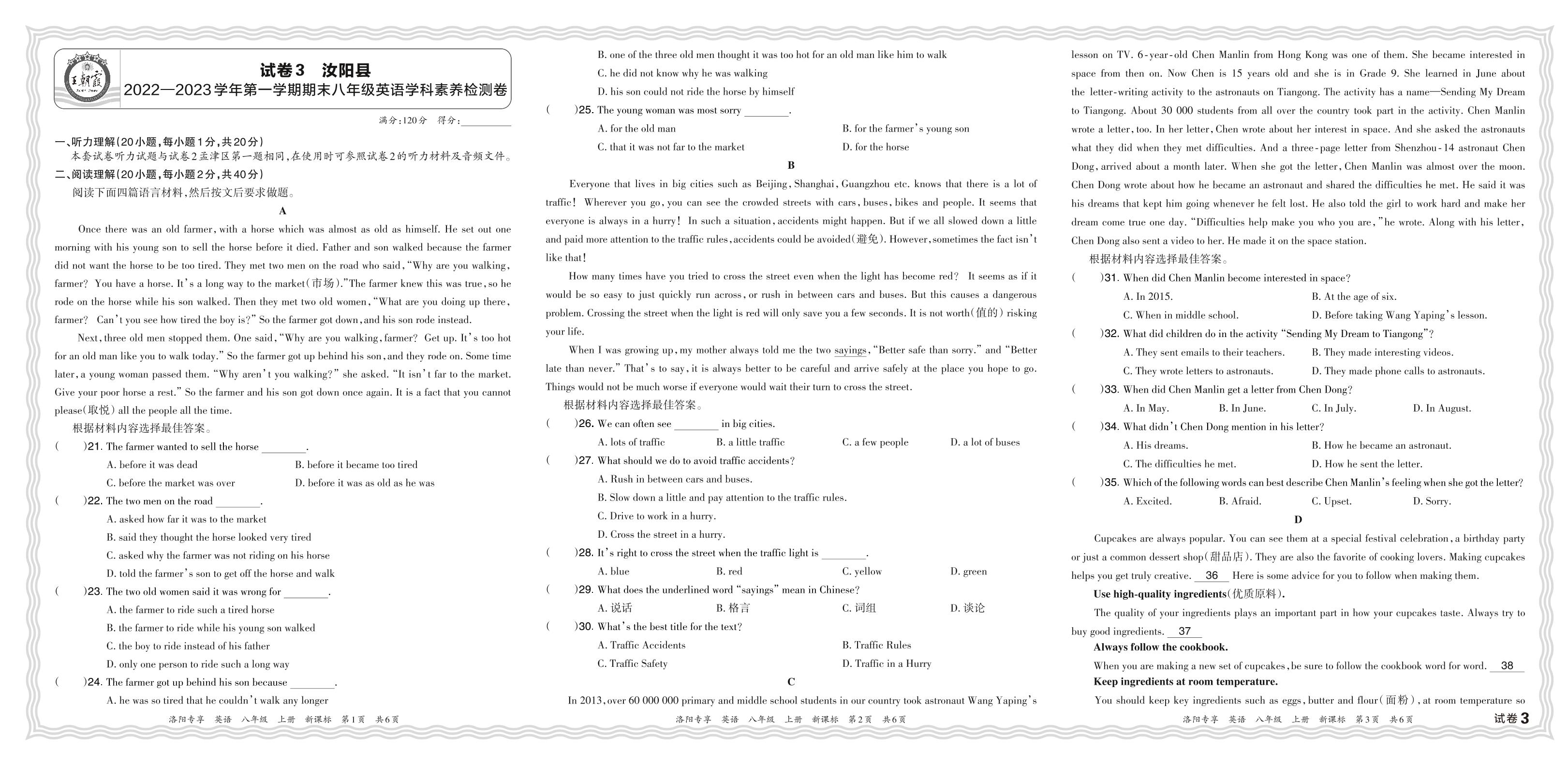 河南省洛阳市汝阳县2022-2023学年第一学期期末八年级英语学科素养检测卷(新课标版)【3】