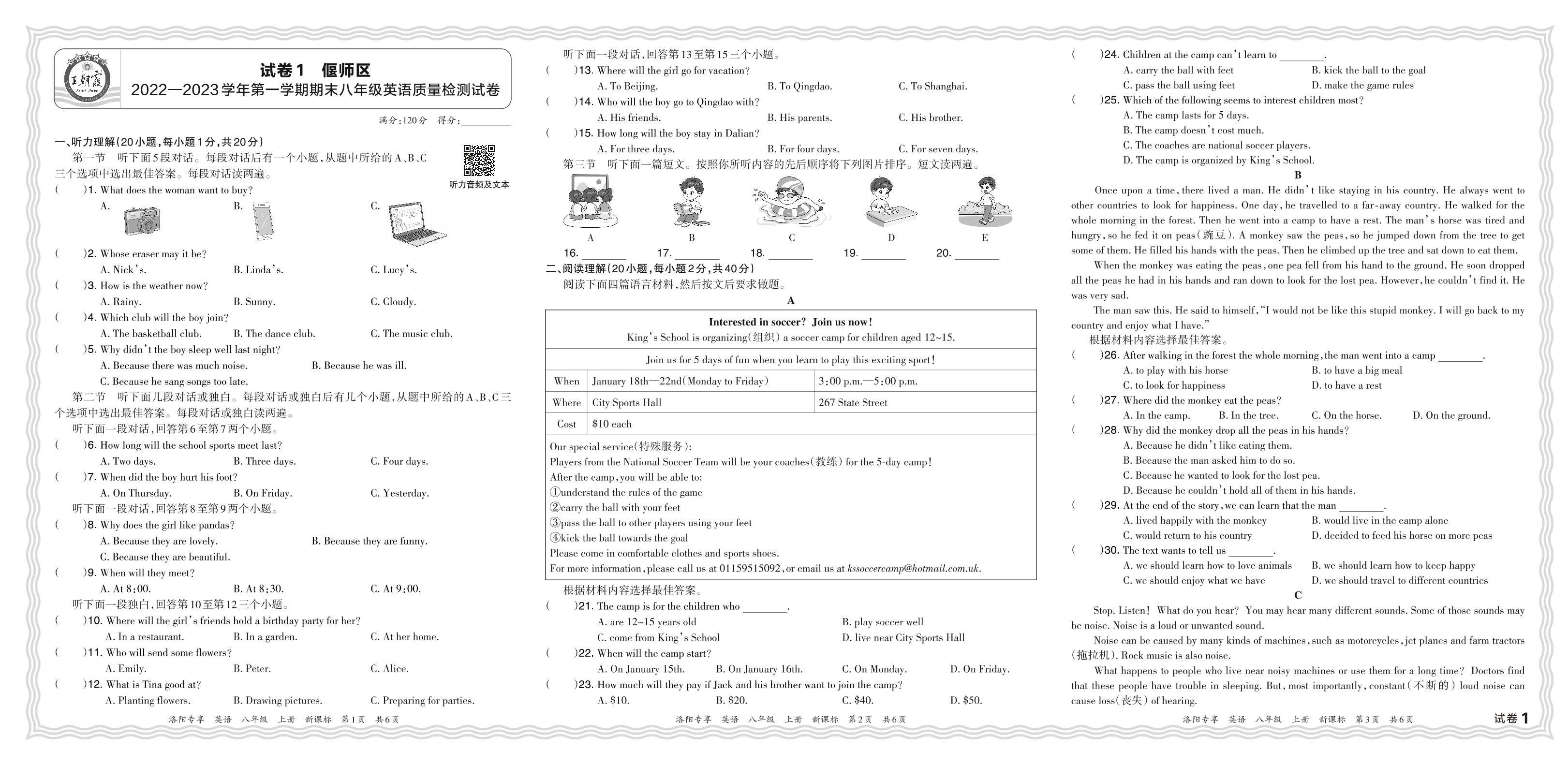 河南省洛阳市偃师区2022-2023学年第一学期期末八年级英语质量检测试卷(新课标版)【1】