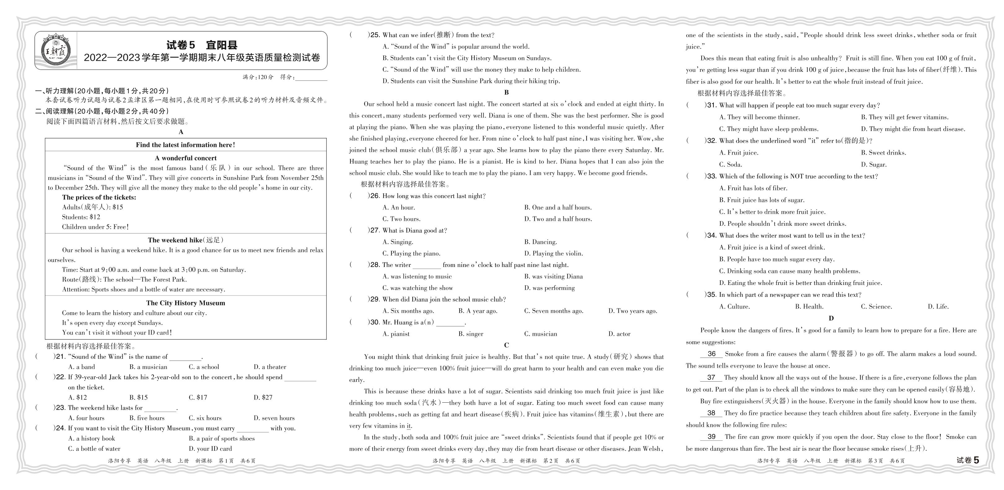 河南省洛阳市宜阳县2022—2023学年第一学期期末八年级英语质量检测试卷(新课标版)【5】
