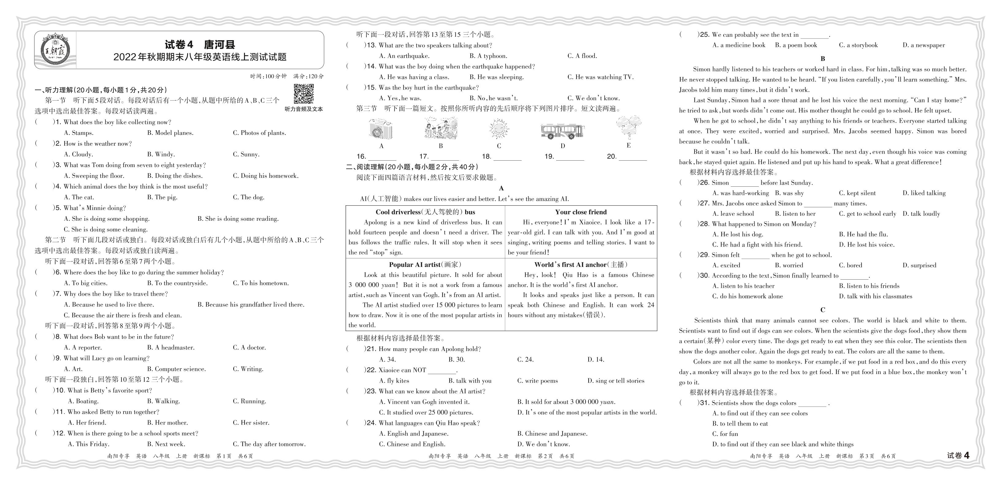 河南省南阳市唐河县2022年秋期期末八年级英语线上测试试题(新课标版)【4】