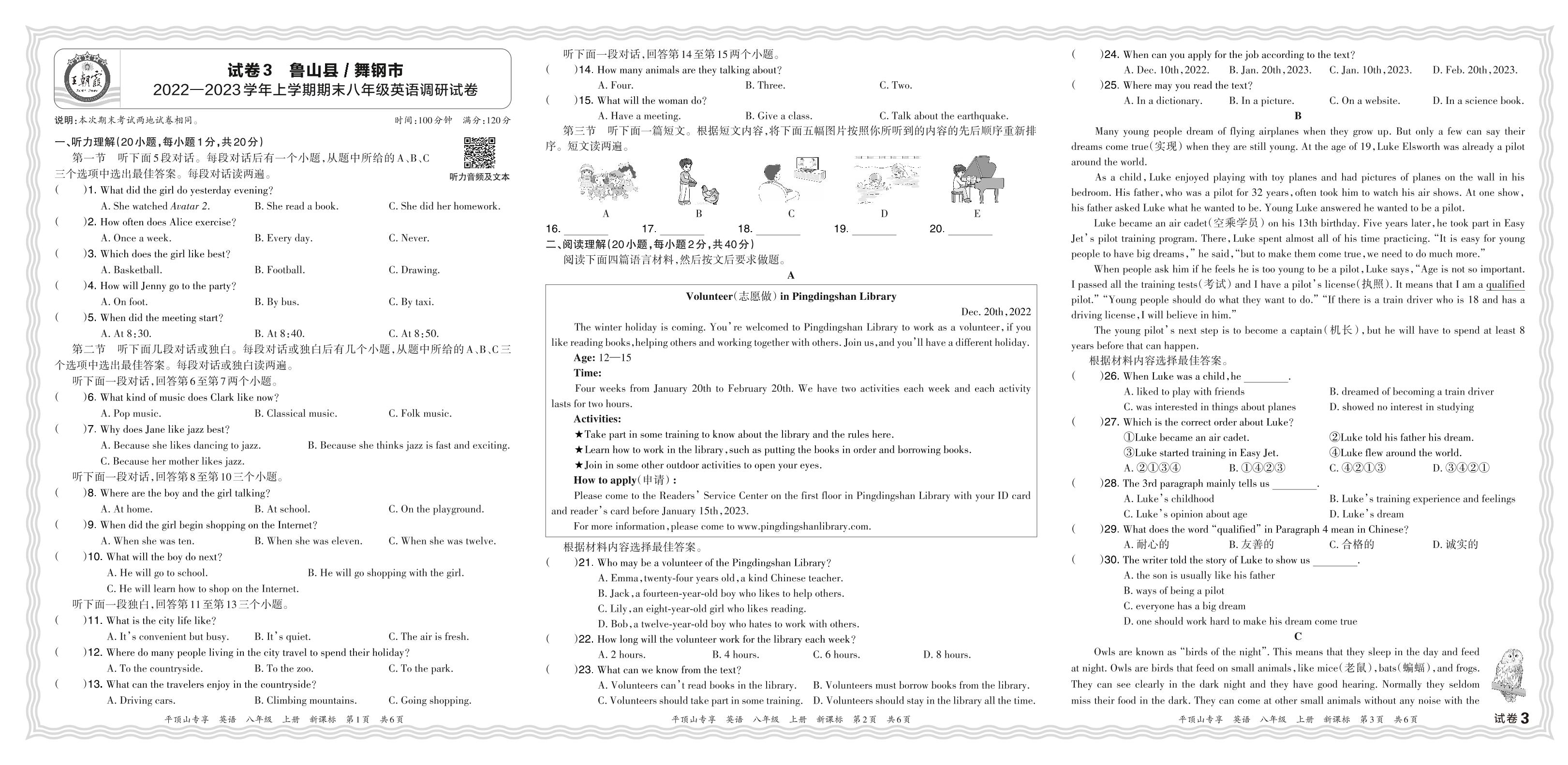 河南省平顶山市鲁山县、舞钢市2022-2023学年上学期期末八年级英语调研试卷(新课标版)【3】