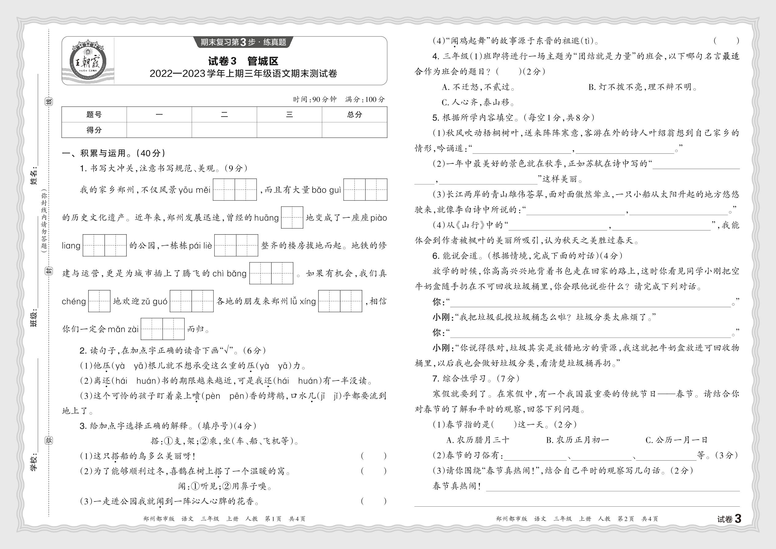 河南省郑州市管城区2022—2023学年上学期三年级语文期末测试卷(人教版)【3】
