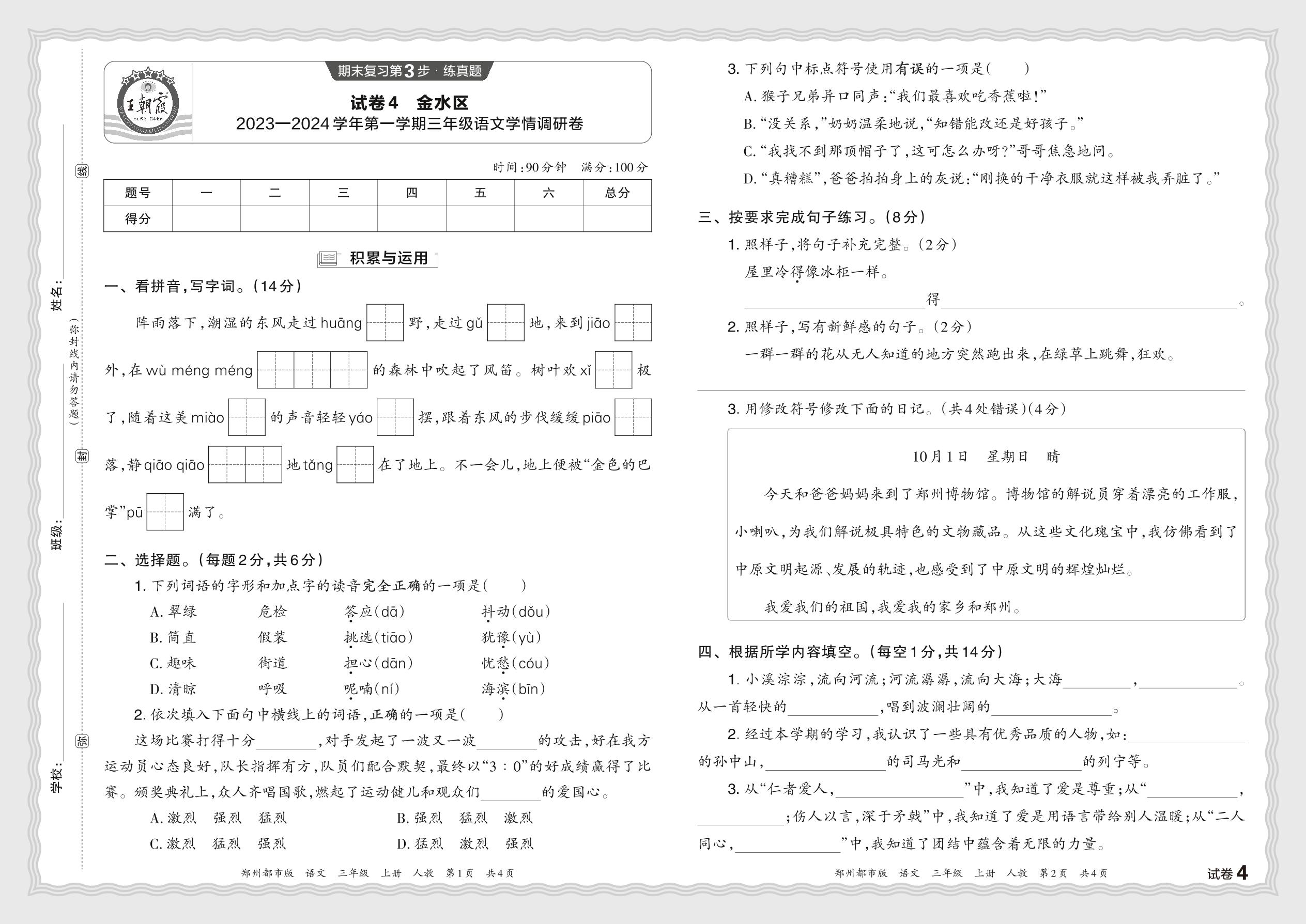 河南省郑州市金水区2023—2024学年第一学期三年级语文学情调研卷(人教版)【4】