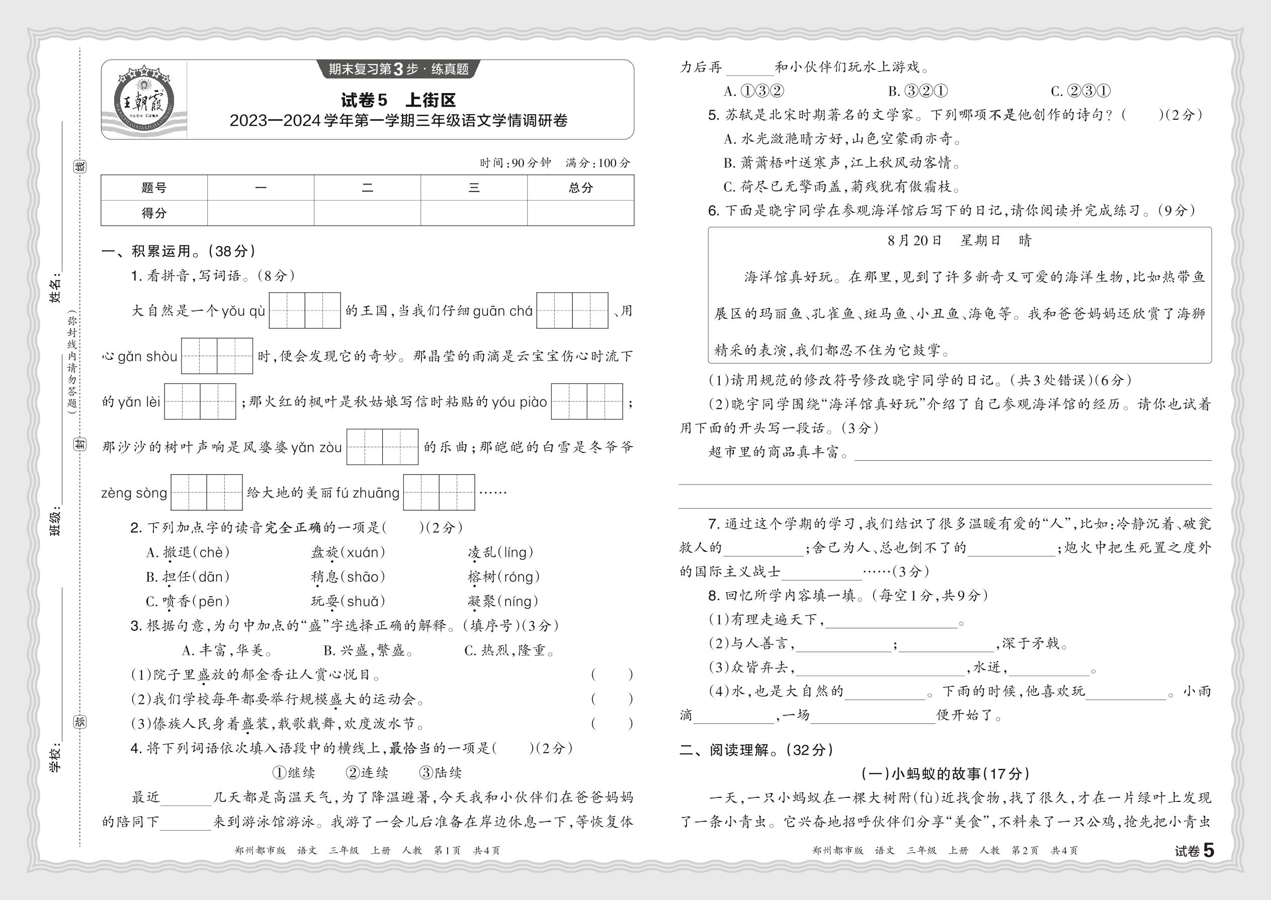 河南省郑州市上街区2023—2024学年第一学期三年级语文学情调研卷(人教版)【5】