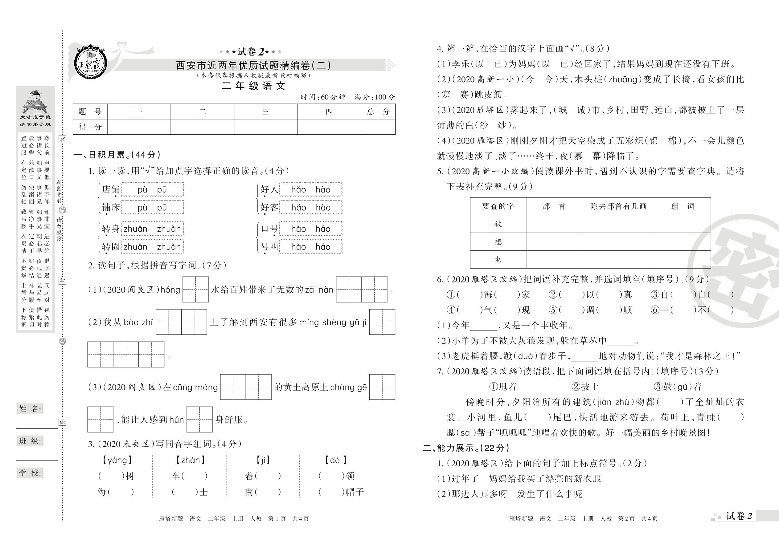 西安市近两年优质试题精编卷(二)二年级上册语文(人教版)【2】