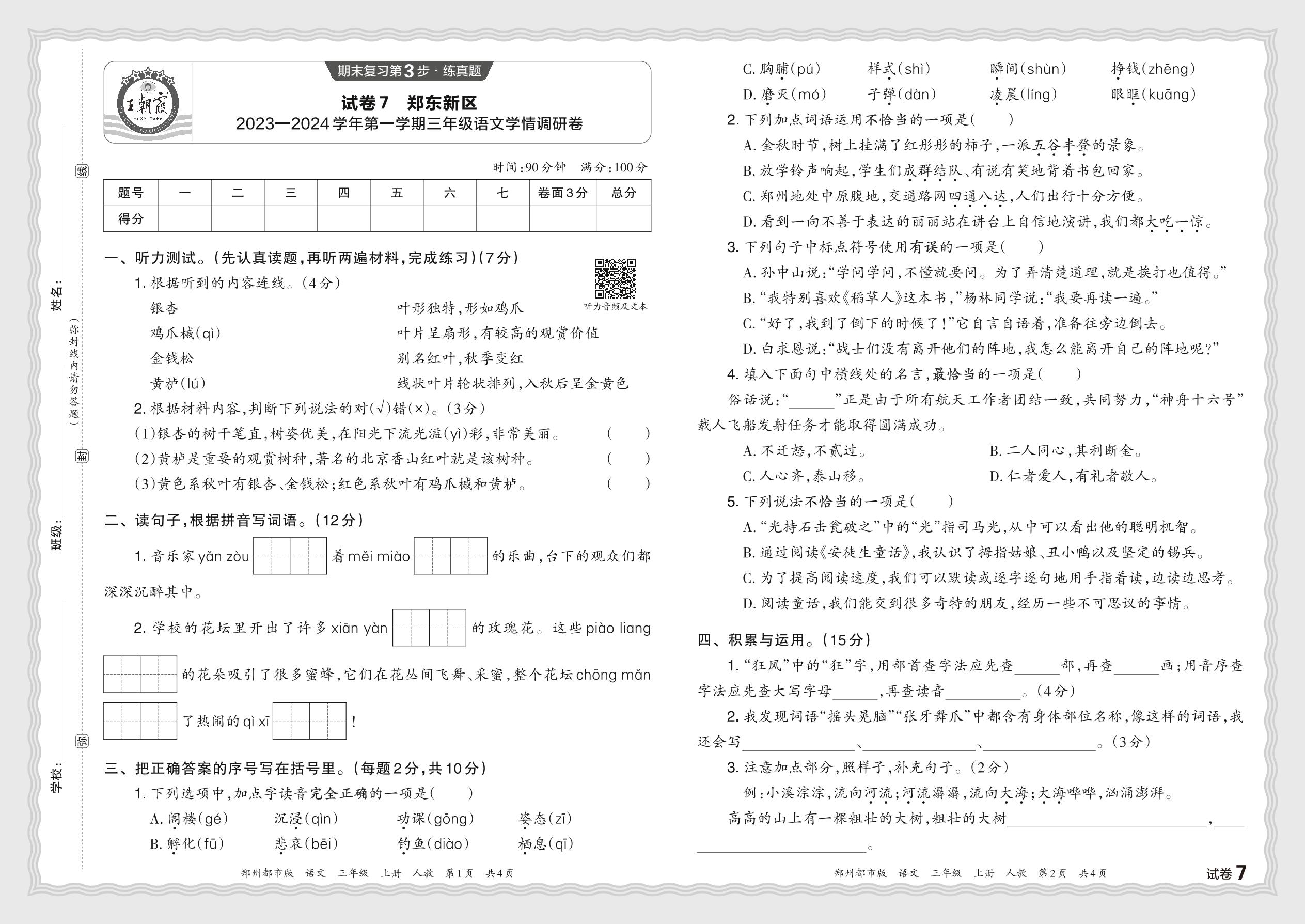 河南省郑州市郑东新区2023—2024学年第一学期三年级语文学情调研卷(人教版)【7】