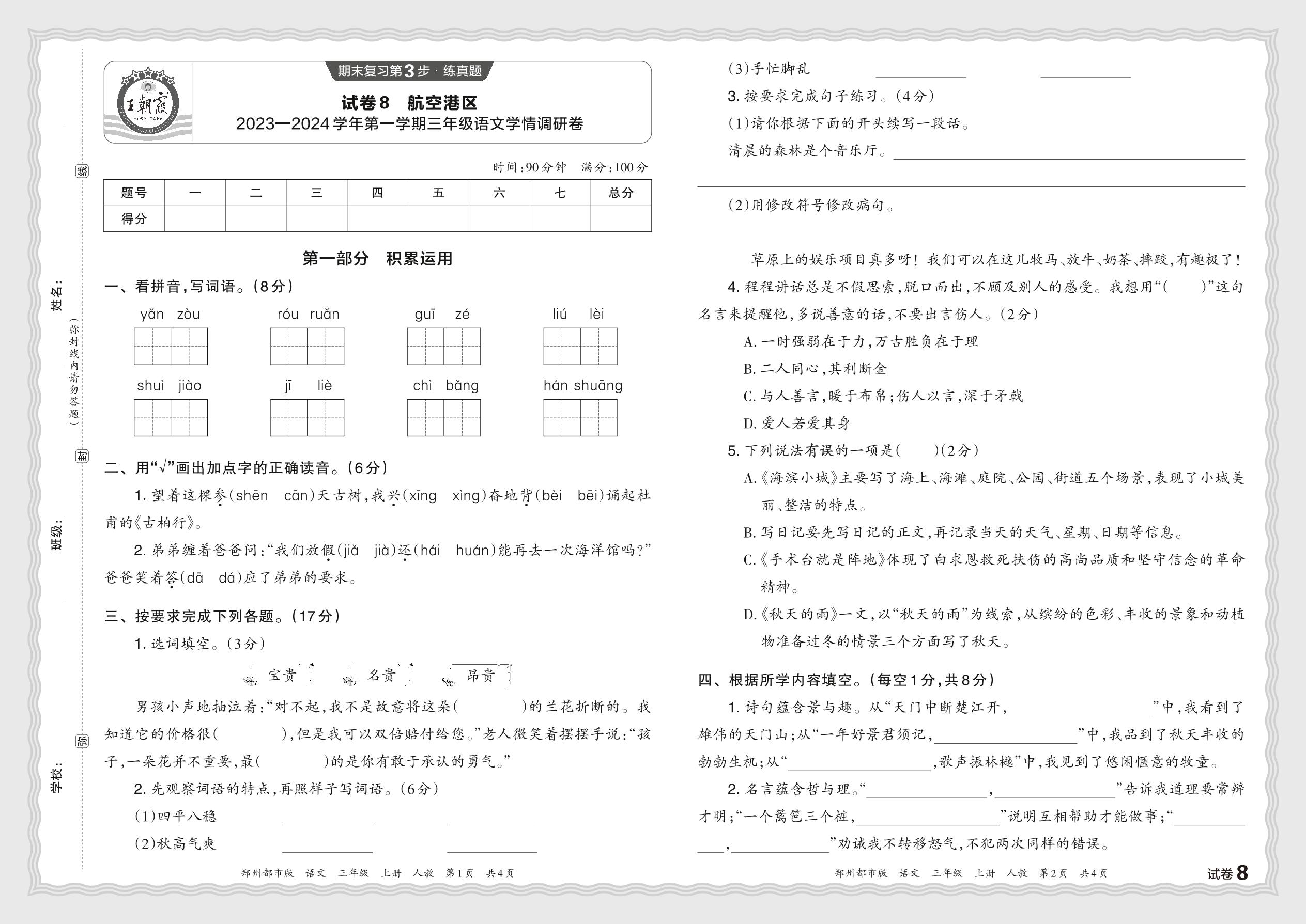 河南省郑州市航空港区2023—2024学年第一学期三年级语文学情调研卷(人教版)【8】
