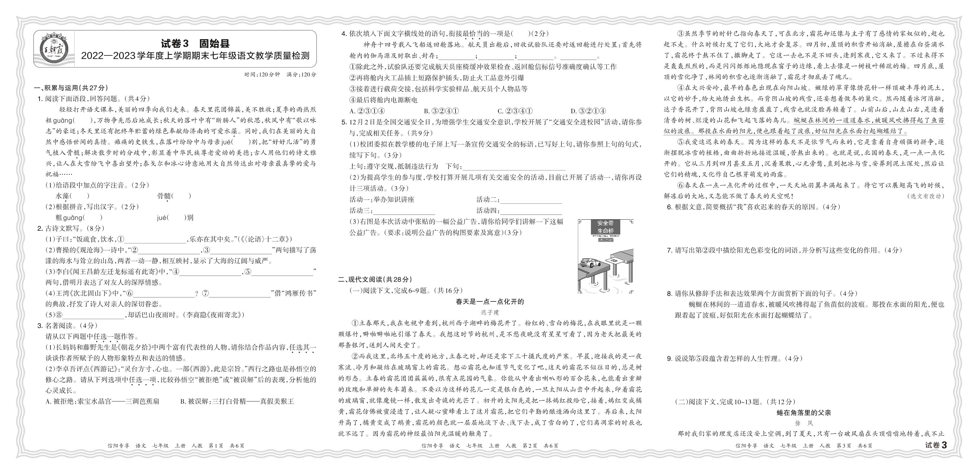 河南省信阳市固始县2022—2023学年度上学期期末七年级语文教学质量检测(人教版)【3】