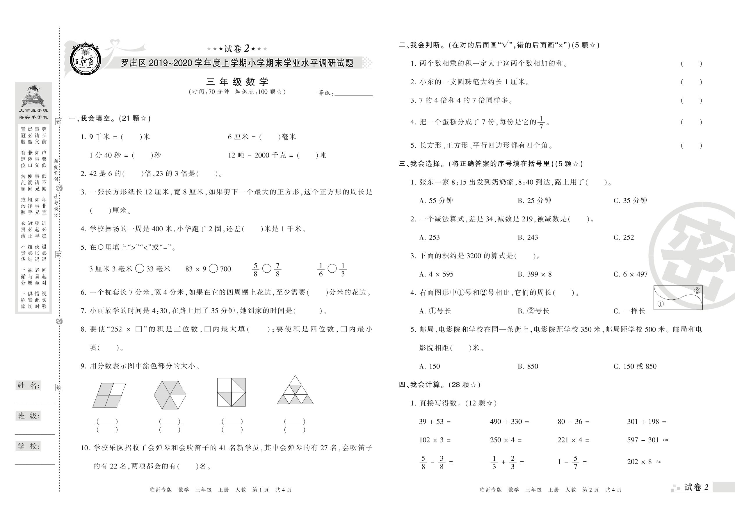 2019-2020学年第一学期临沂市罗庄区三年级数学试卷(人教版)【2】