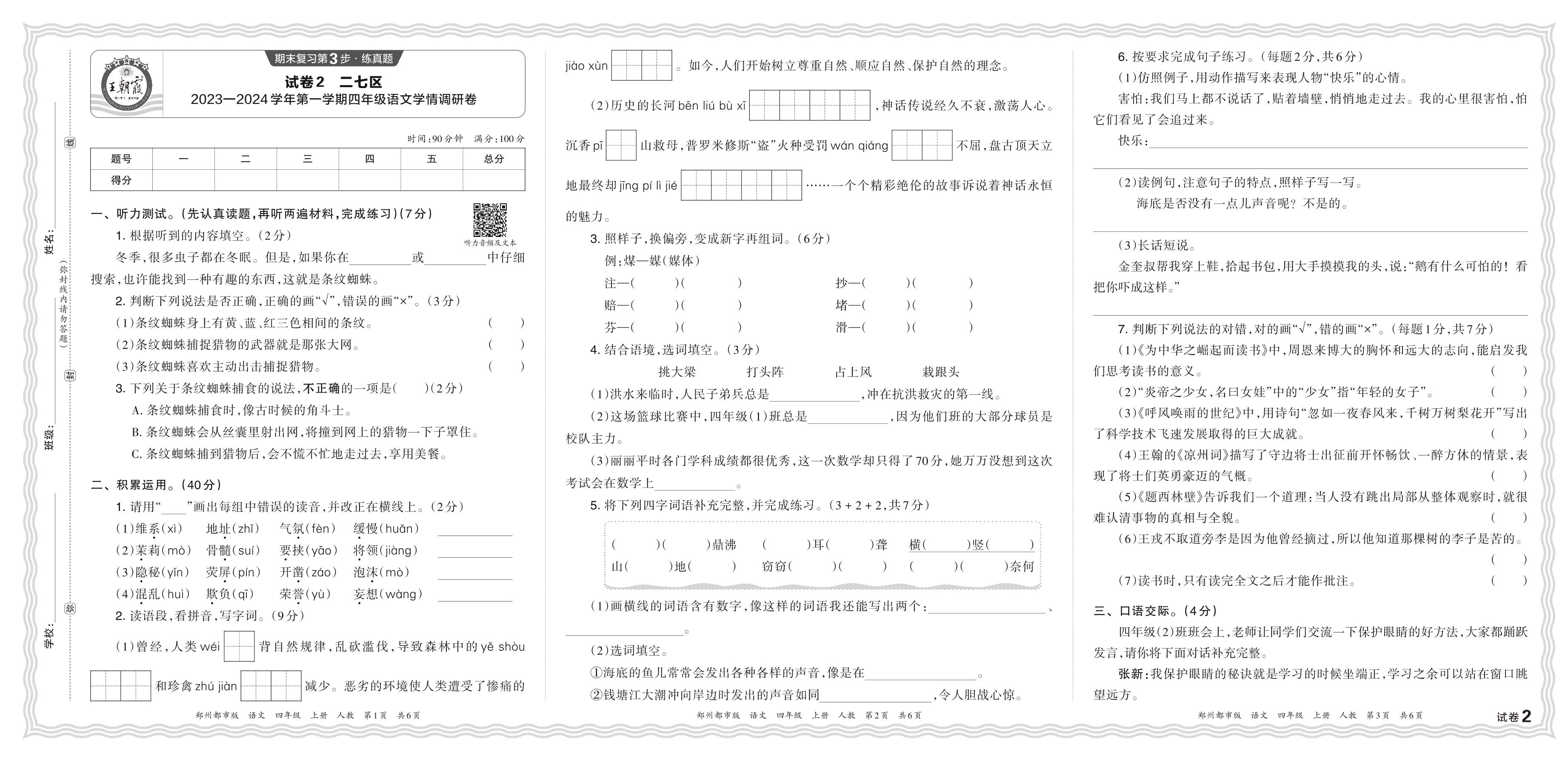 河南省郑州市二七区2023—2024学年第一学期四年级语文学情调研卷(人教版)【2】