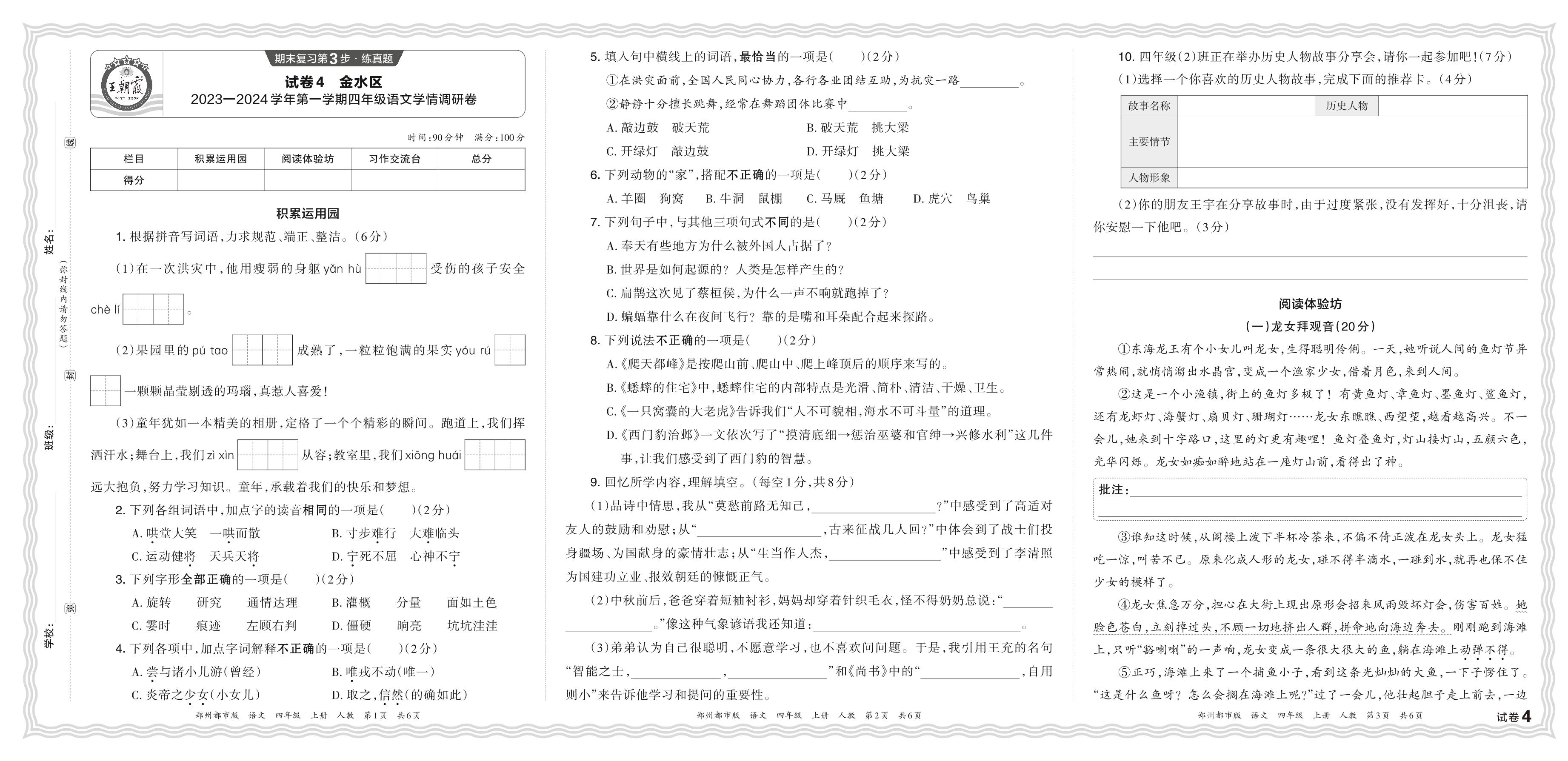 河南省郑州市金水区2023—2024学年第一学期四年级语文学情调研卷(人教版)【4】