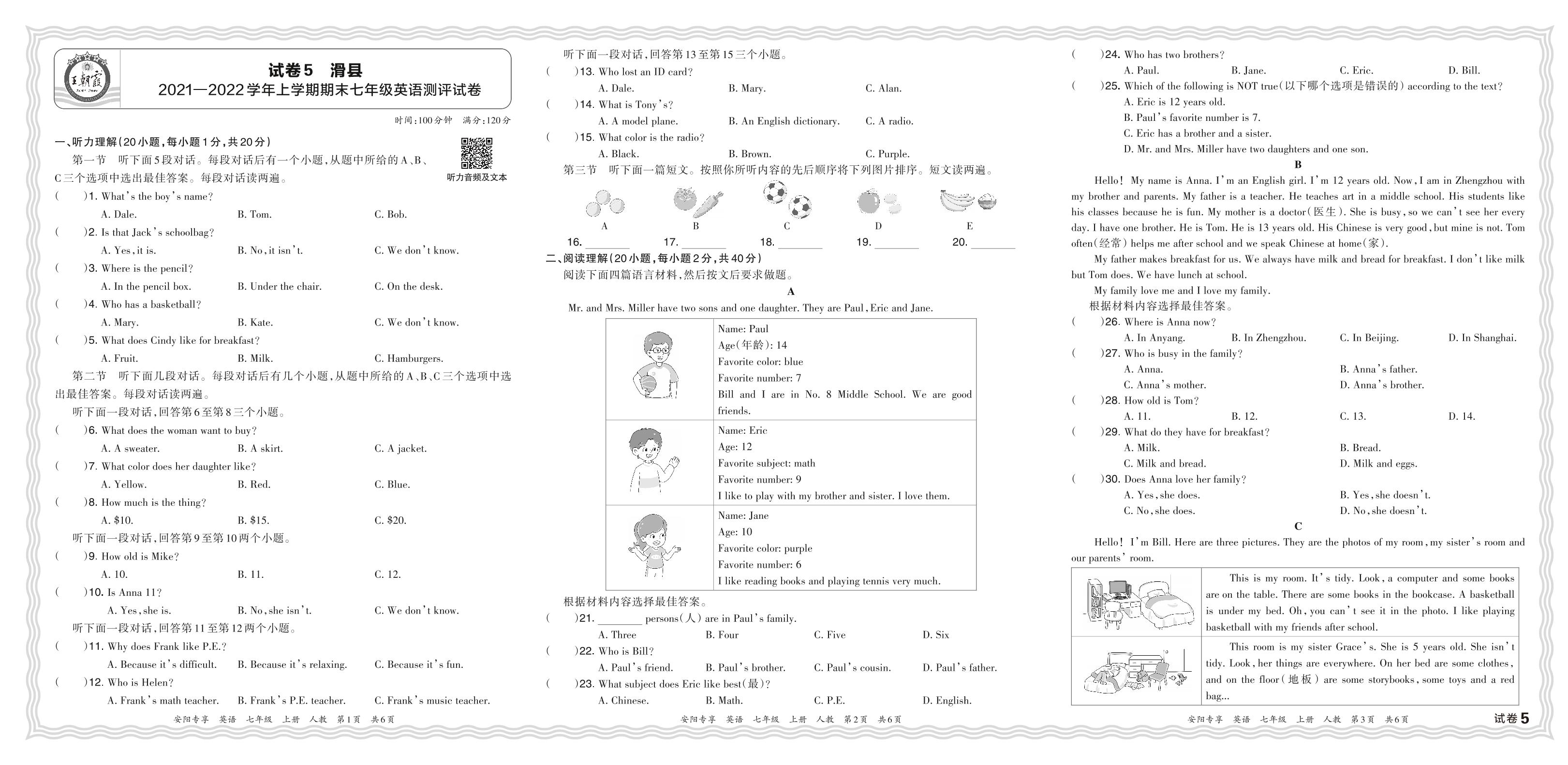 河南省安阳市滑县2021—2022学年上学期期末七年级英语测评试卷(人教版)【5】