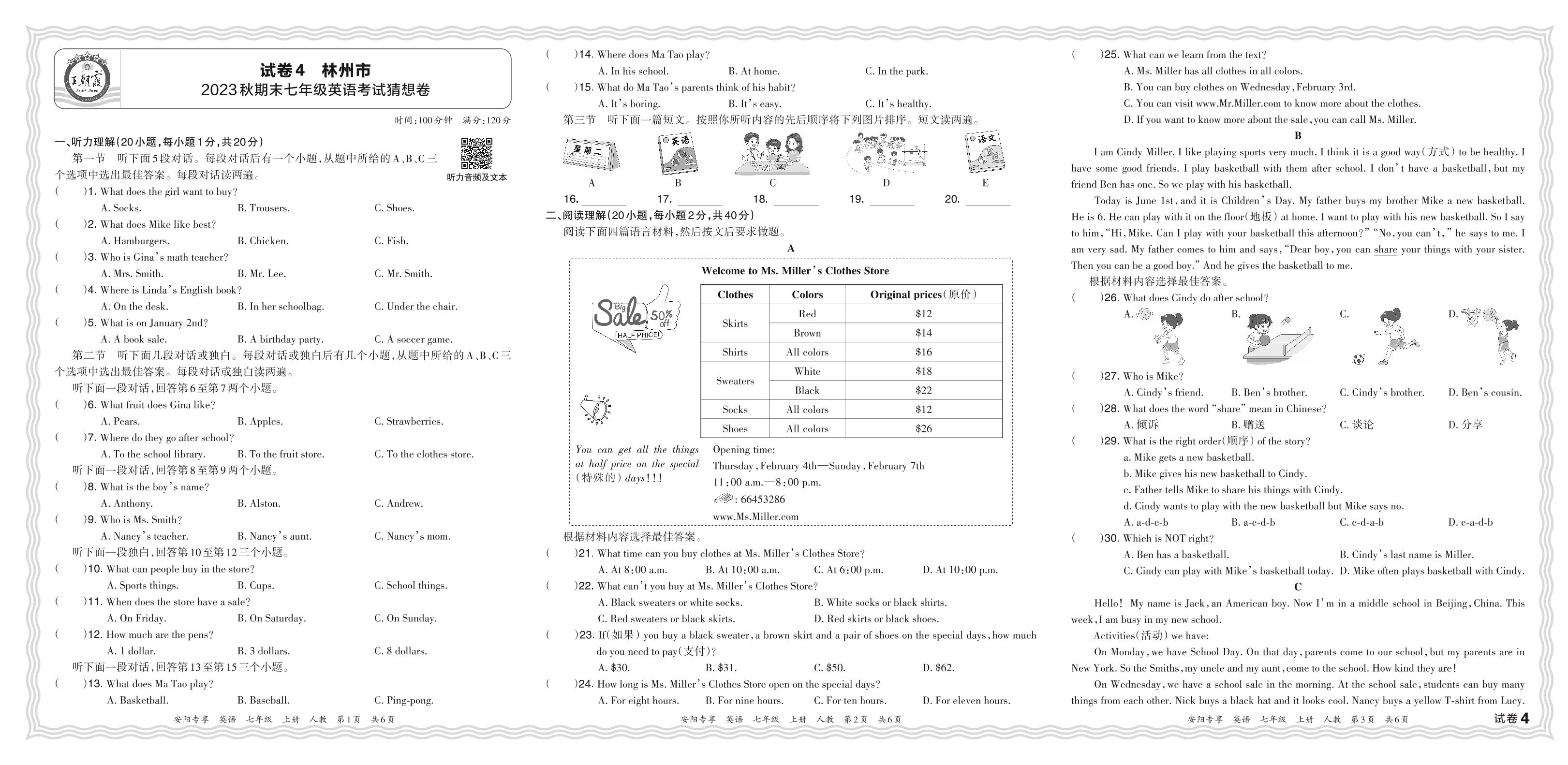 河南省安阳市林州市2023秋期末七年级英语考试猜想卷(人教版)【4】