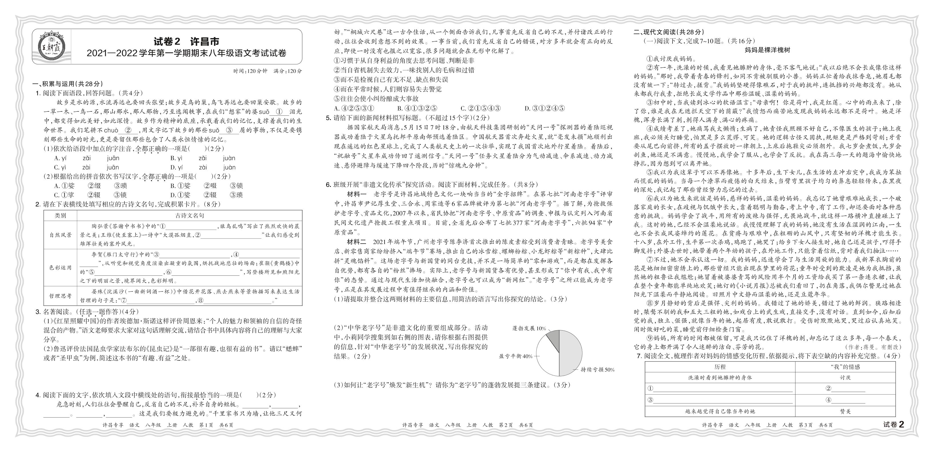 河南省许昌市2021—2022学年第一学期期未八年级语文考试试卷(人教版)【2】
