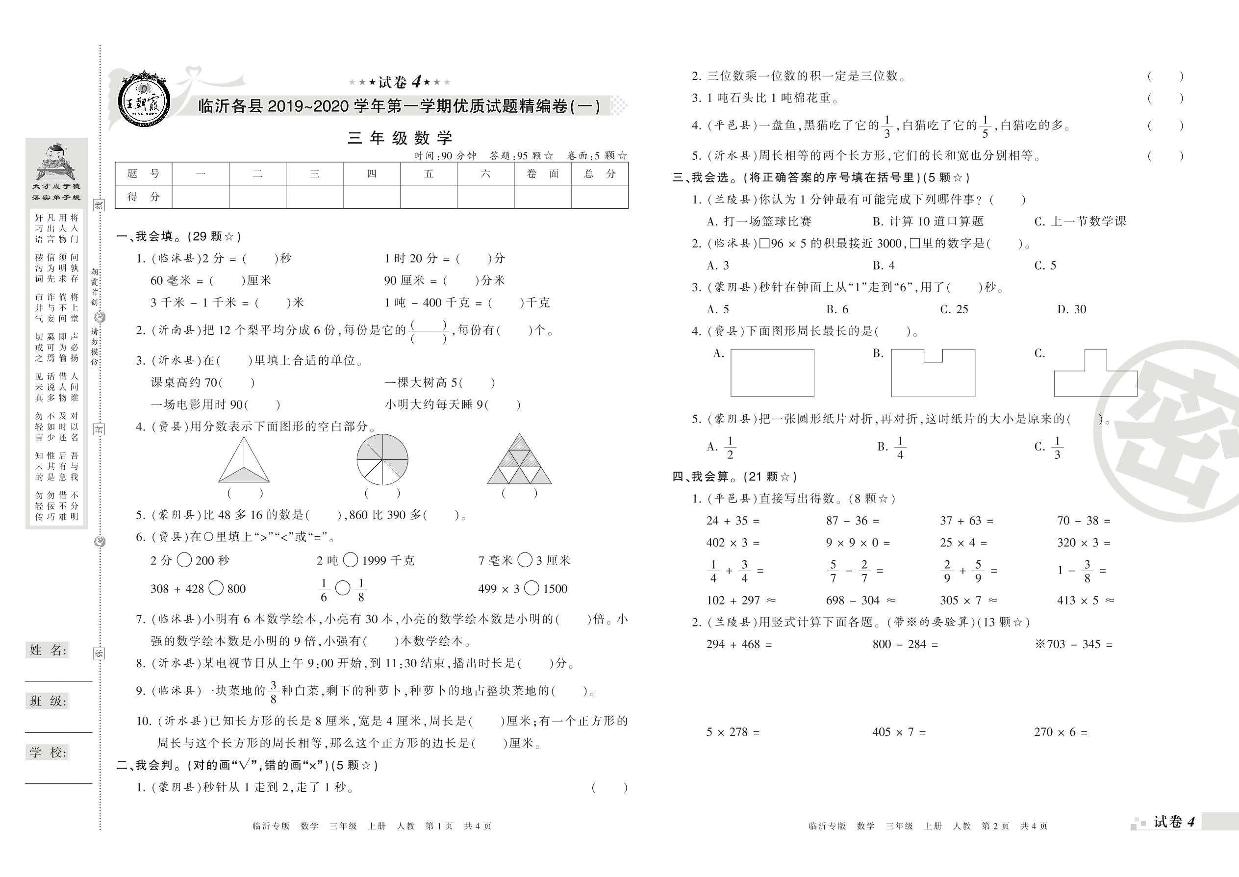 精编卷(一)三年级上册数学(人教版)【4】