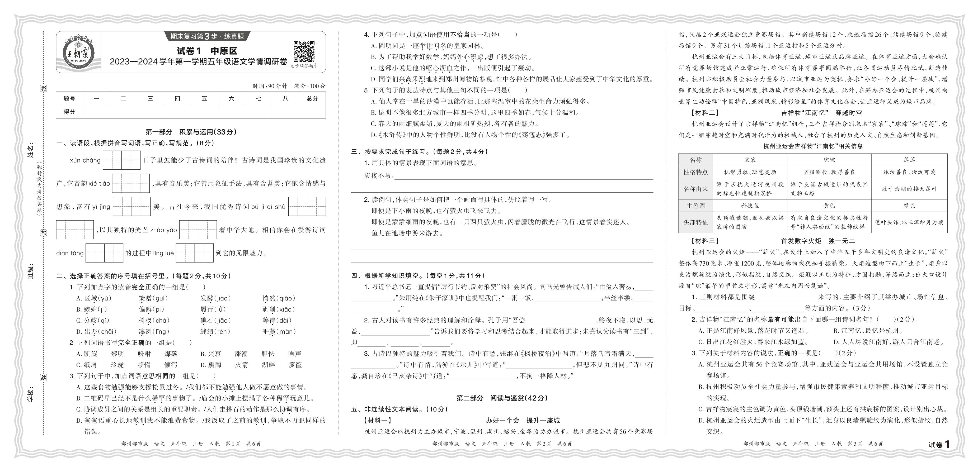 河南省郑州市中原区2023—2024学年第一学期五年级语文学情调研卷(人教版)【1】