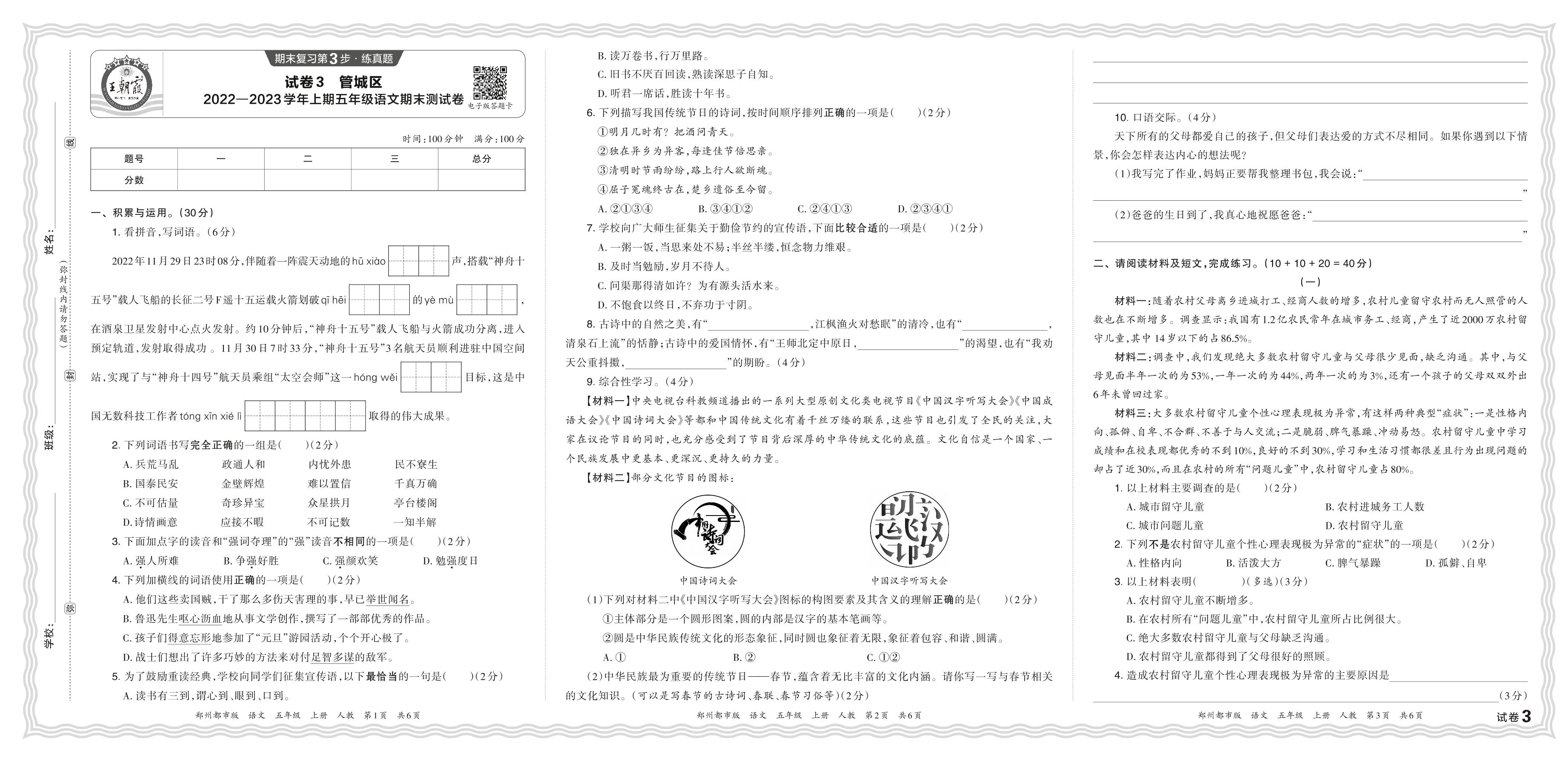 河南省郑州市管城区2022—2023学年上学期五年级语文期末测试卷(人教版)【3】