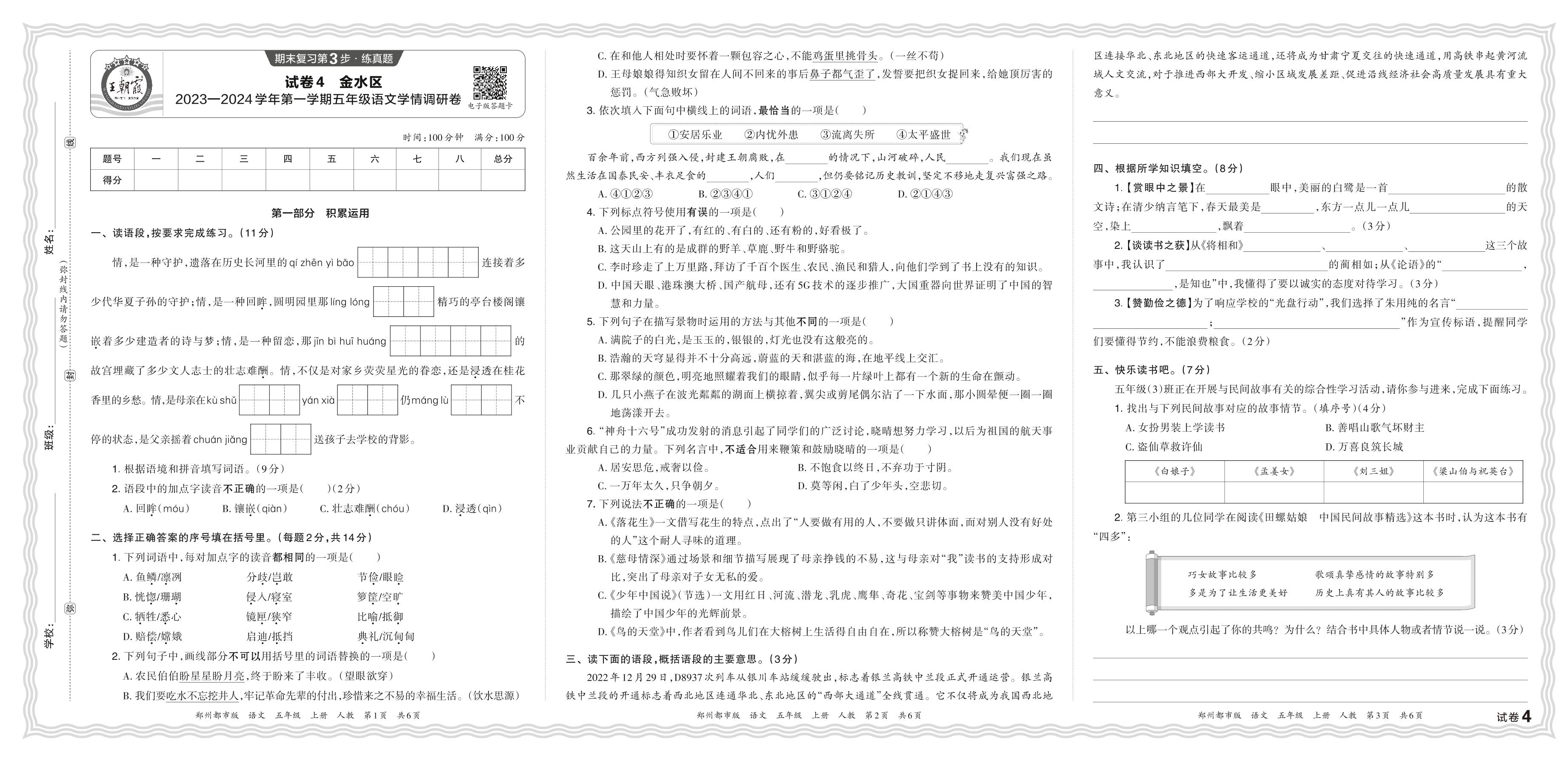 河南省郑州市金水区2023—2024学年第一学期五年级语文学情调研卷(人教版)【4】