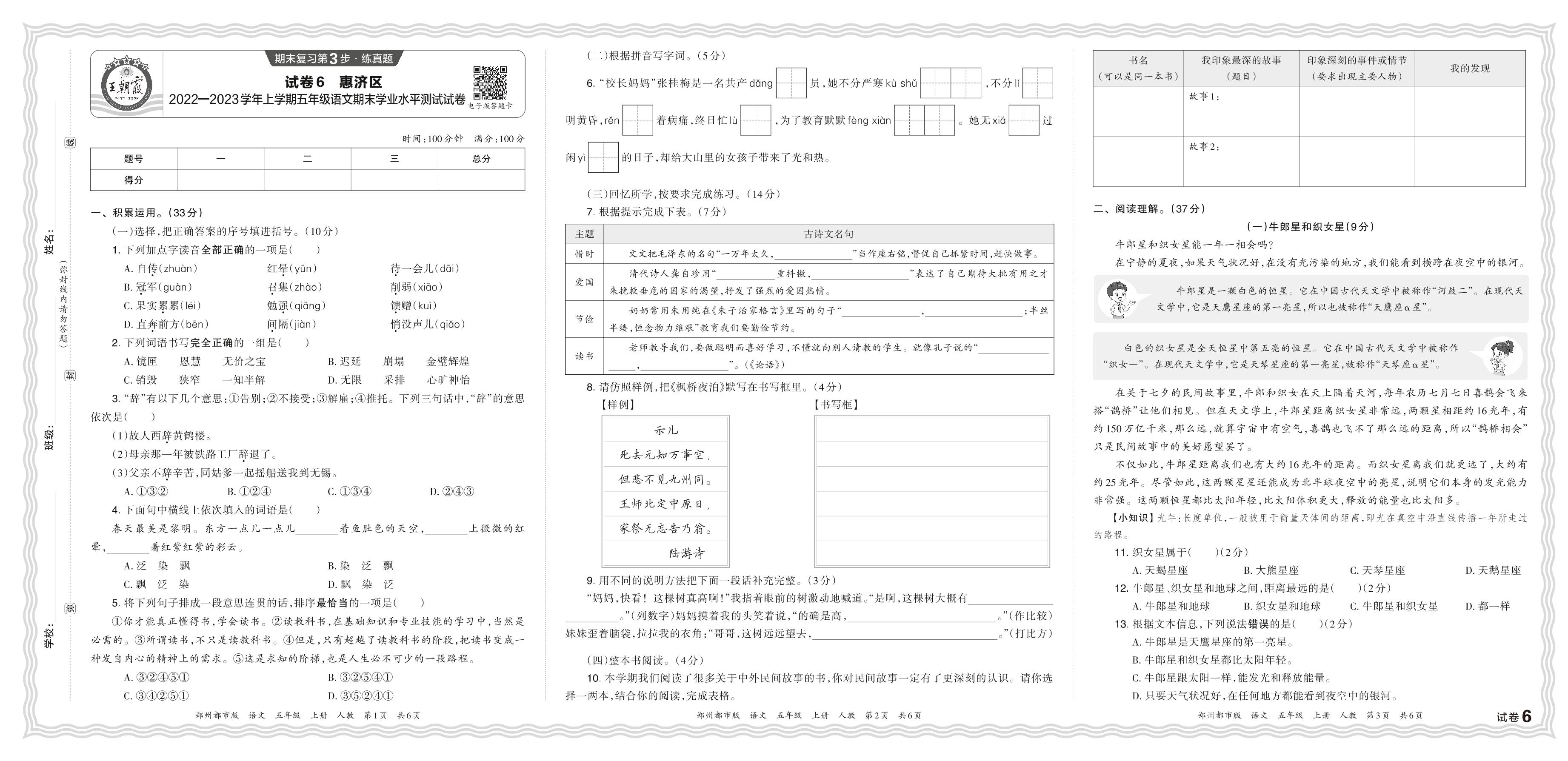 河南省郑州市惠济区2022—2023学年度上学期五年级语文期末学业水平测试试卷(人教版)【6】