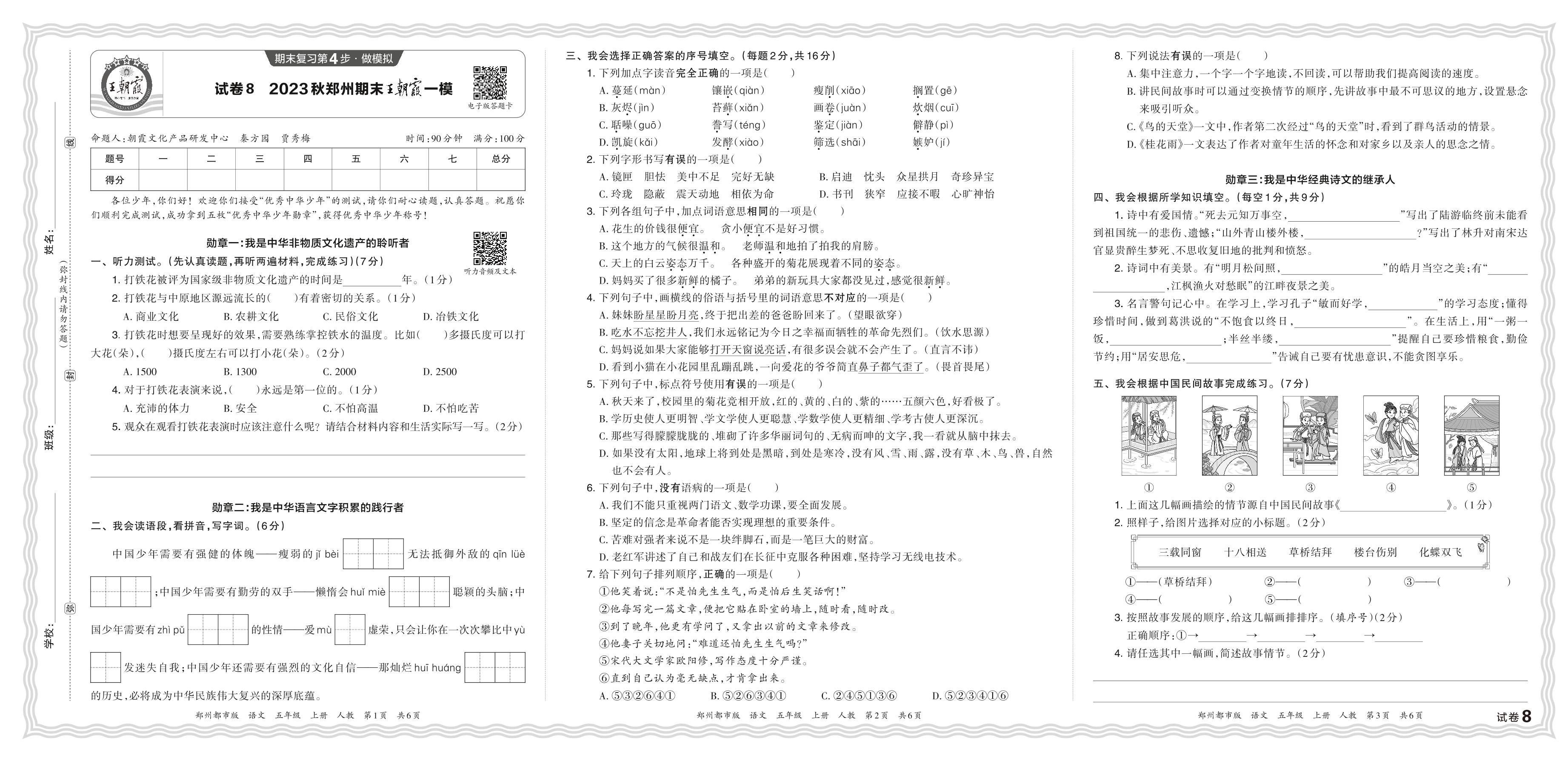 2023秋上册五年级语文人教版 河南郑州期末王朝霞一模【8】