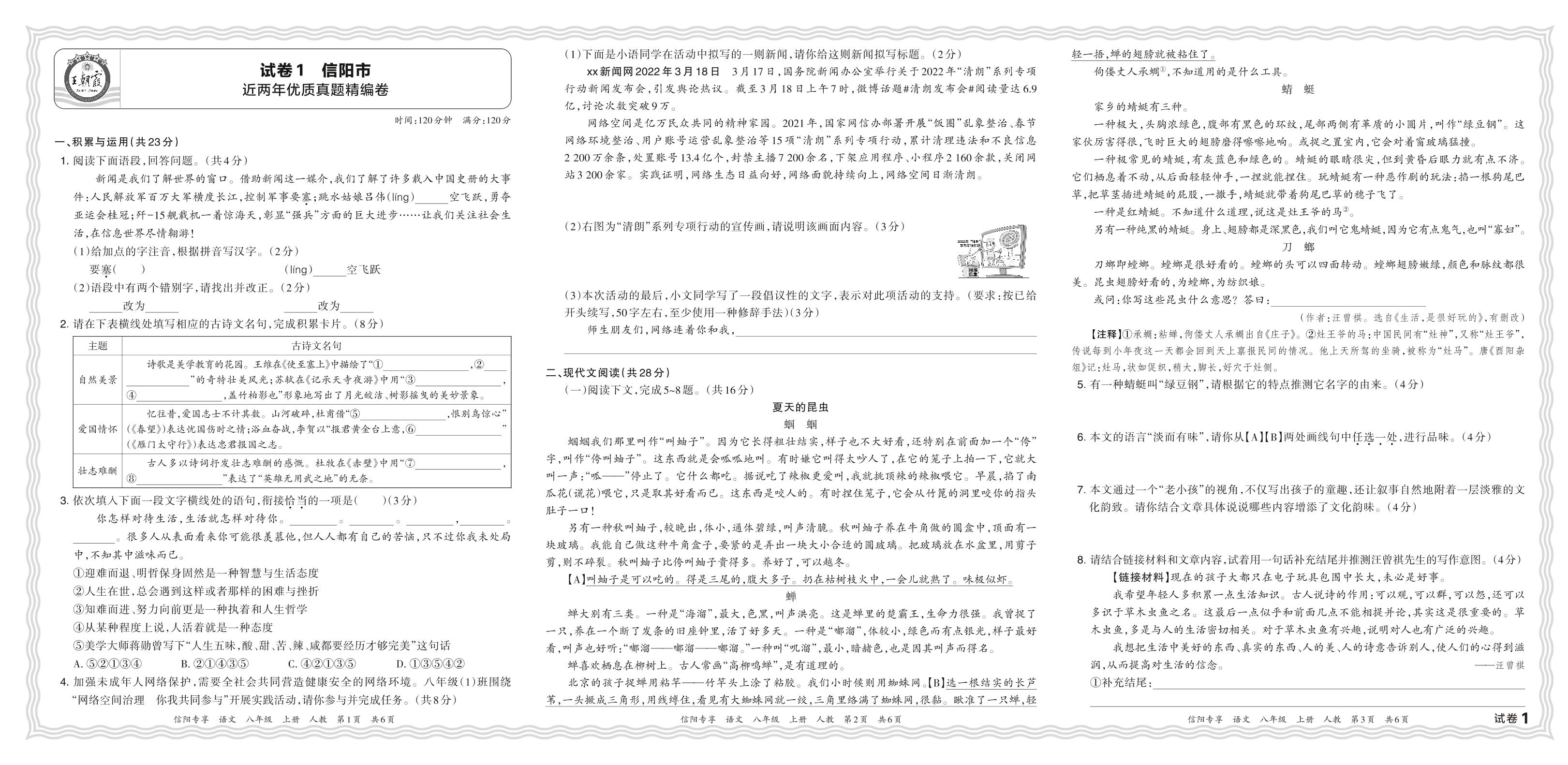 2023秋河南省信阳市近两年优质真题精编卷八年级上册期末语文(人教版)【1】