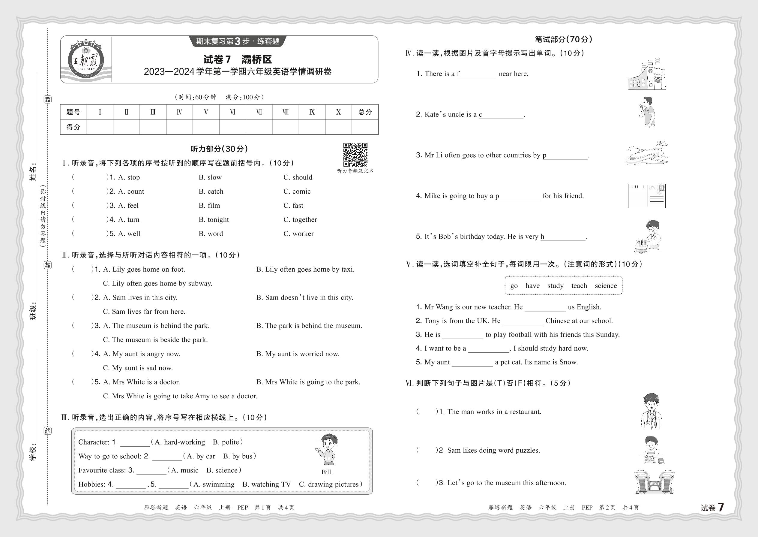 陕西省西安市灞桥区2023—2024学年第一学期六年级英语学情调研卷(PEP版)【7】