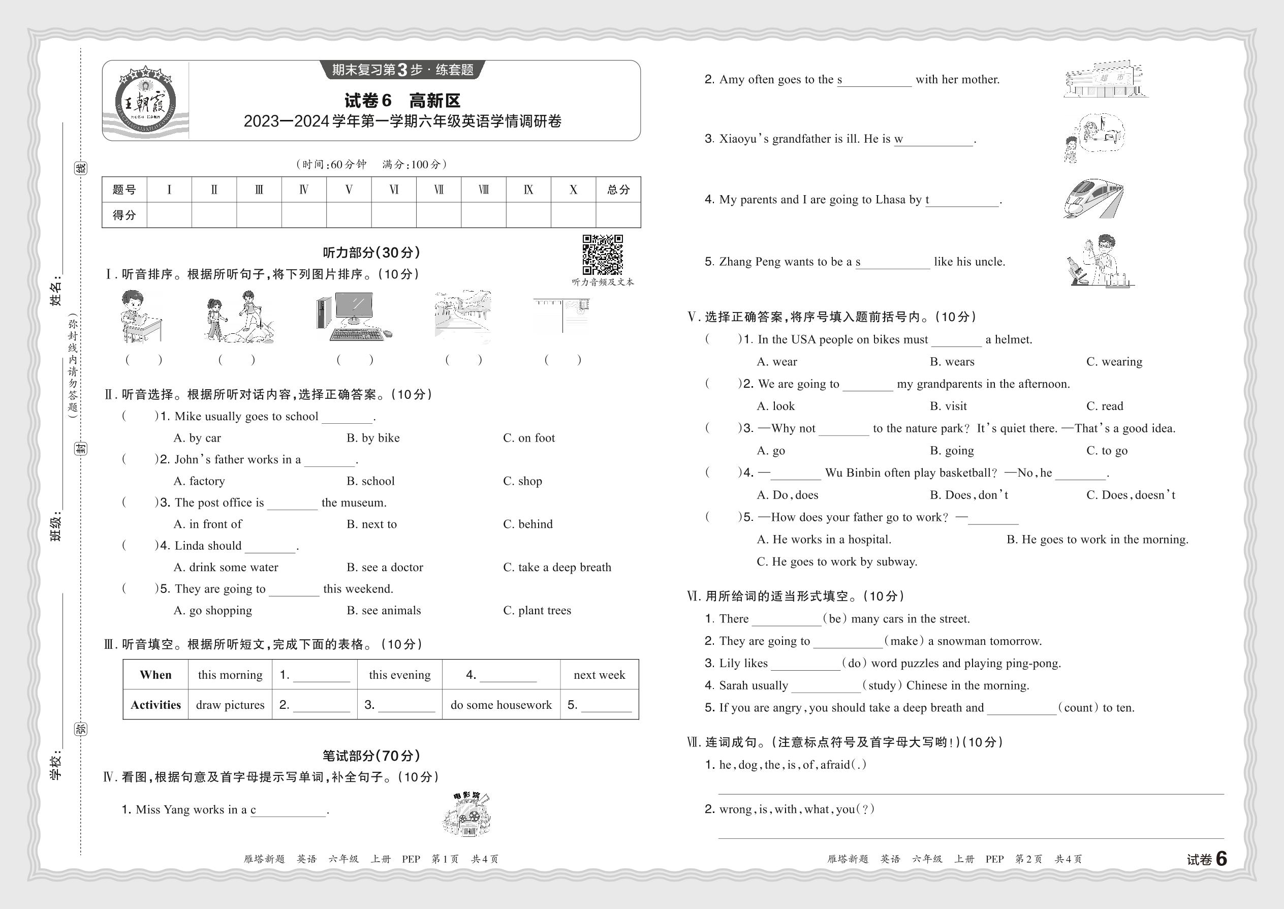 陕西省西安市高新区2023—2024学年第一学期六年级英语学情调研卷(PEP版)【6】