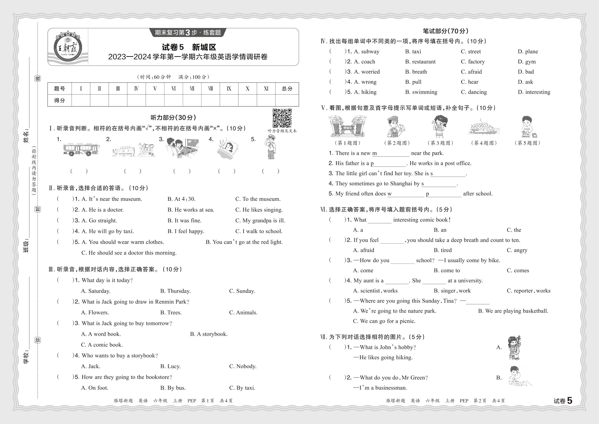 陕西省西安市新城区2023—2024学年第一学期六年级英语学情调研卷(PEP版)【5】