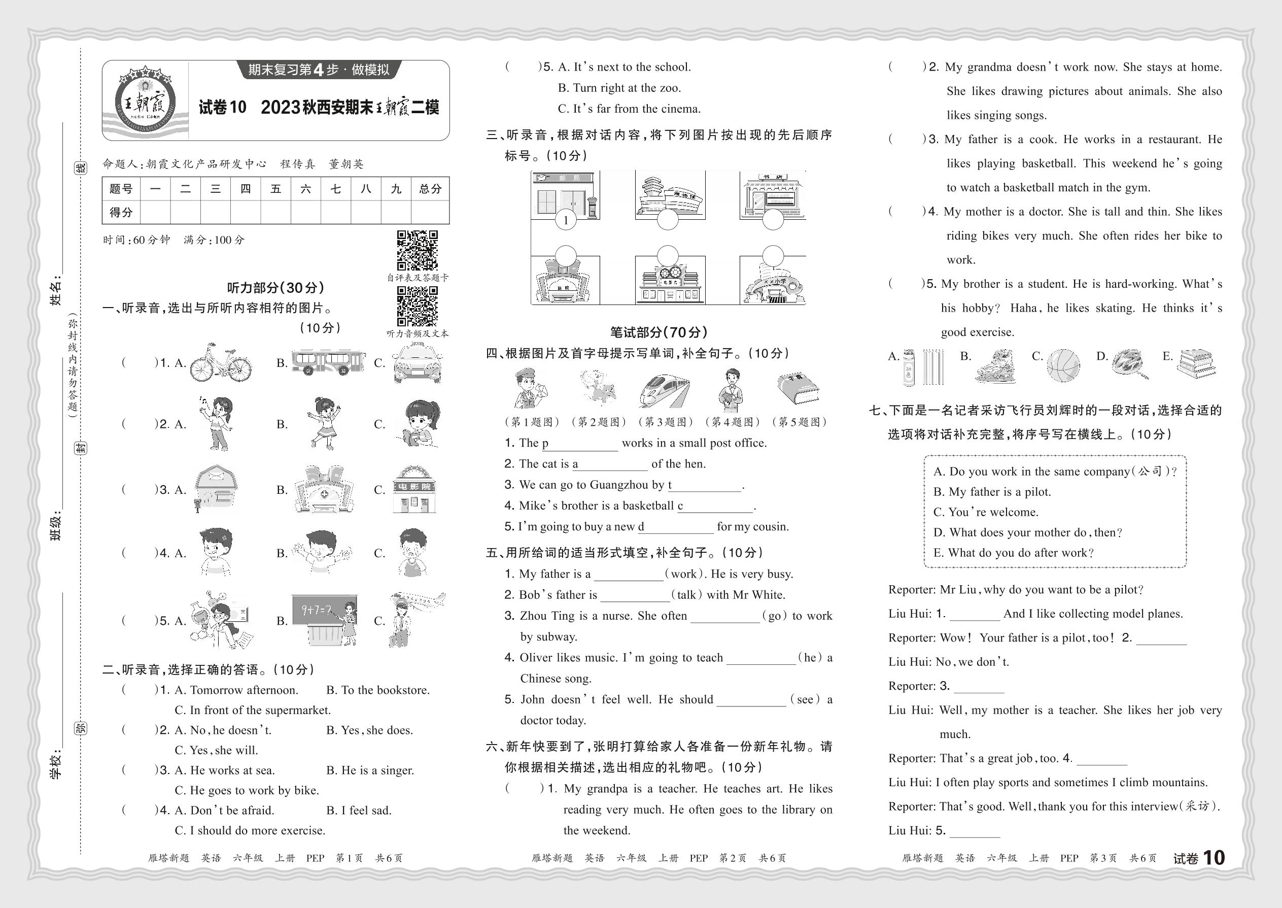 2023秋上册六年级英语人教PEP版 陕西西安期末王朝霞二模