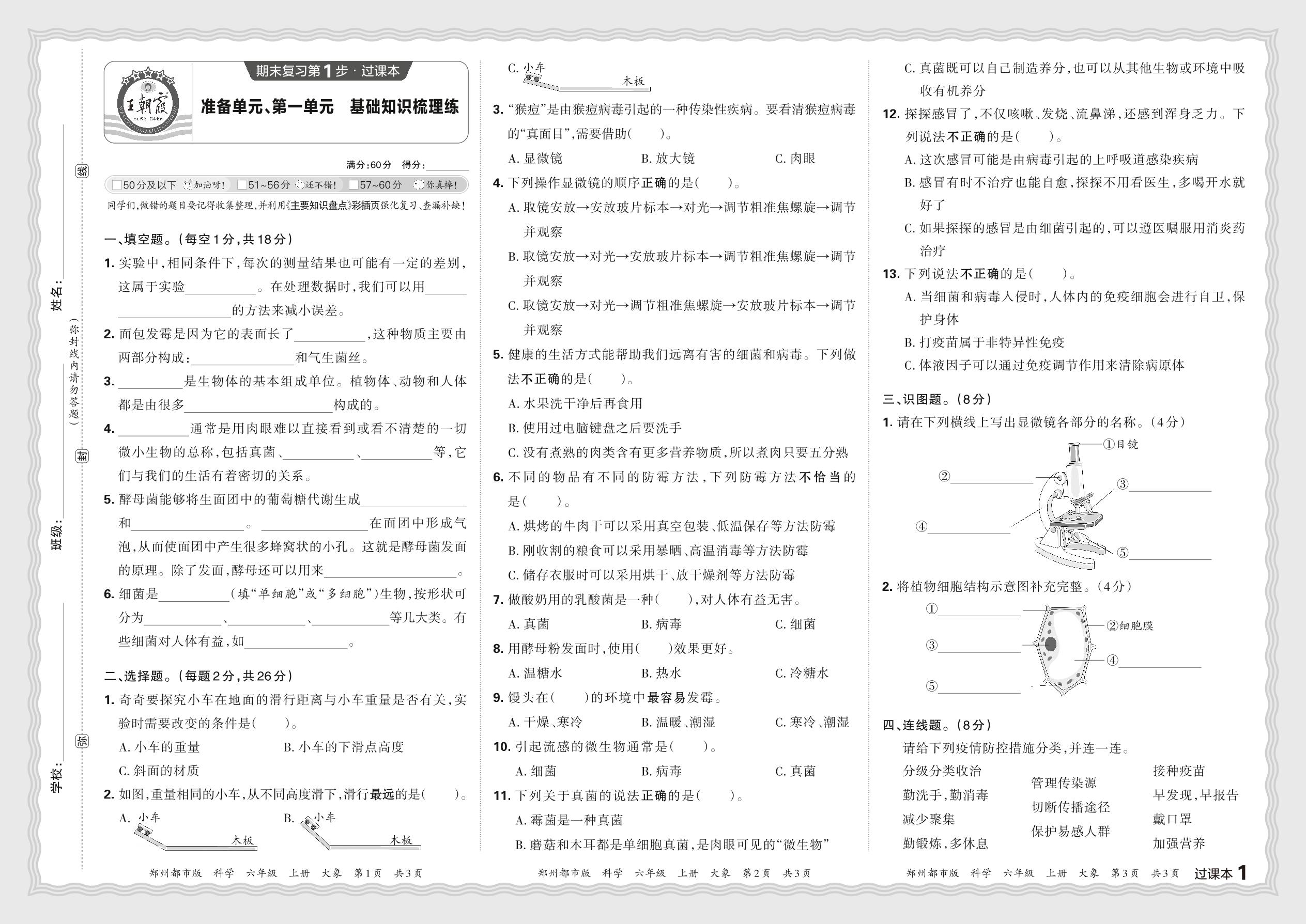 2023秋上册六年级科学大象版 期末过课本·准备单元、第一单元 基础知识梳理练【1】