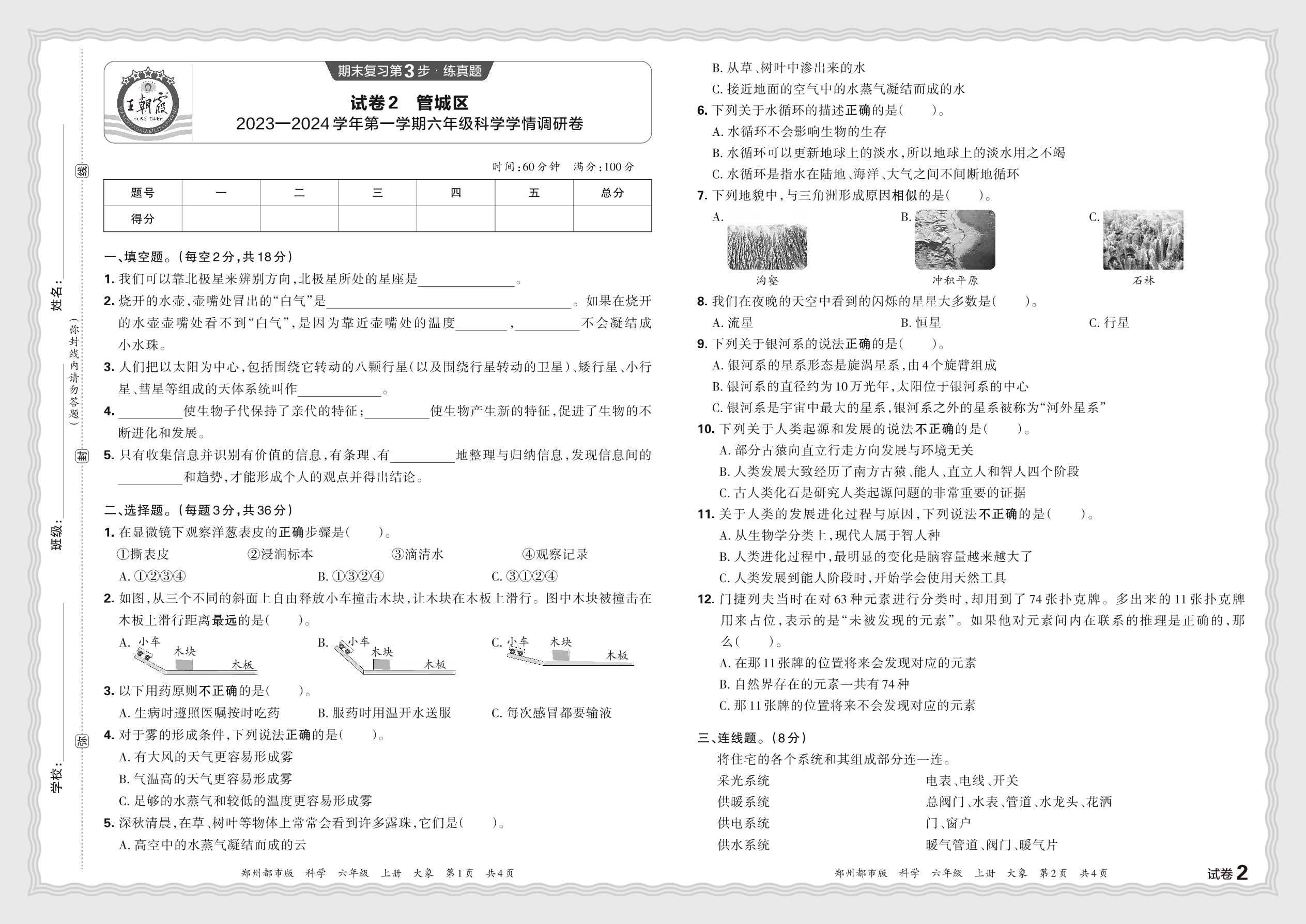 河南省郑州市管城区2023—2024学年第一学期六年级科学学期调研卷(大象版)【2】