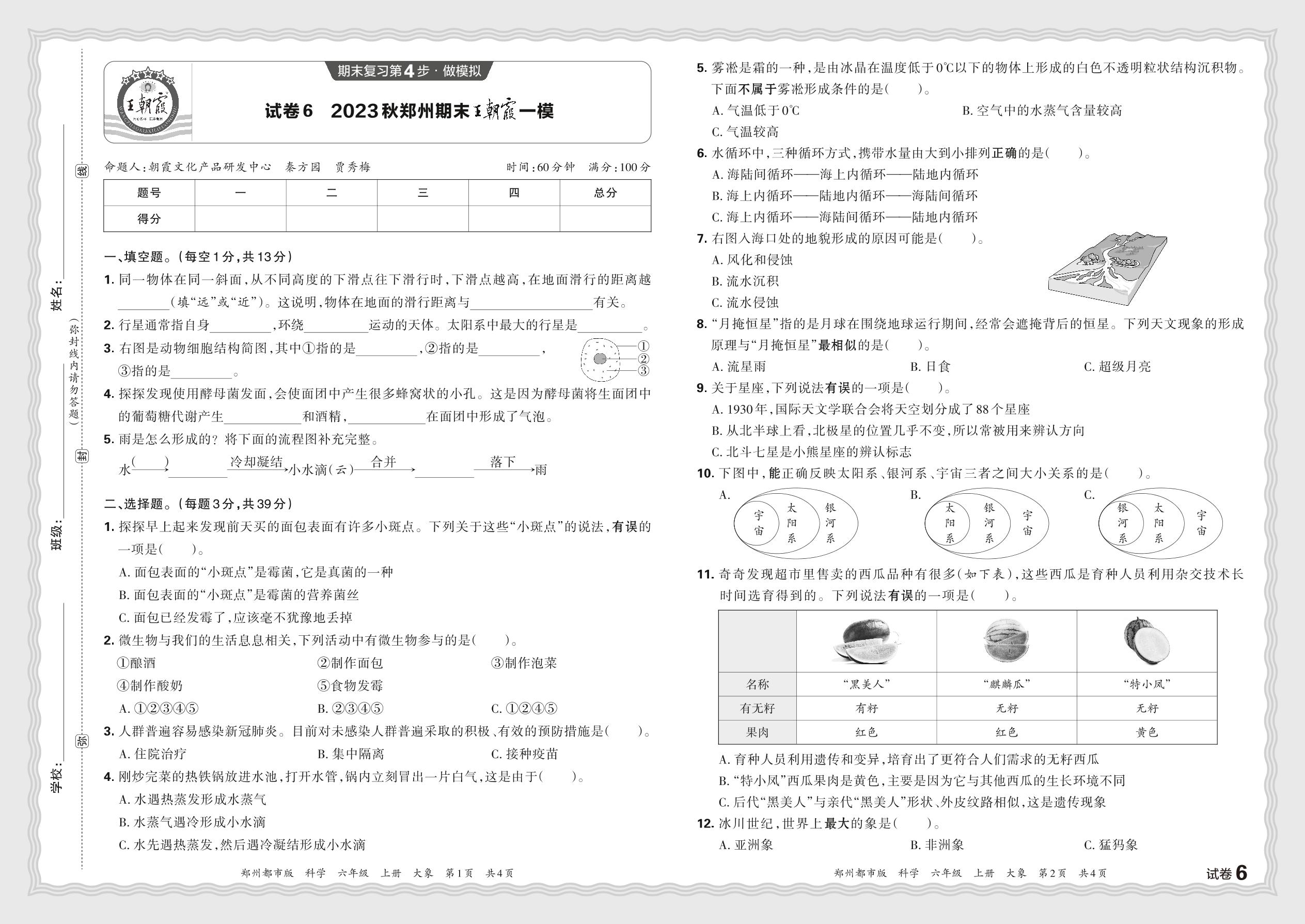 2023秋上册六年级科学大象版 河南郑州期末王朝霞一模【6】