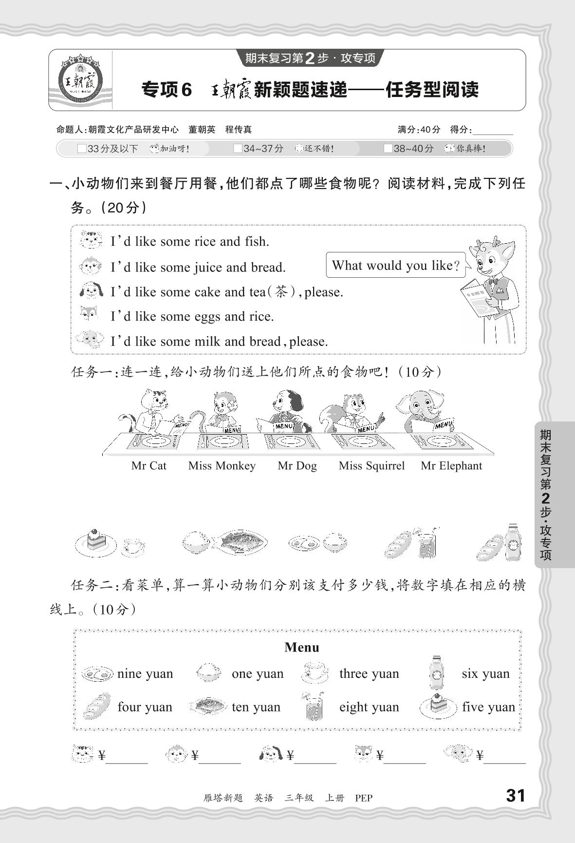 2023秋上册三年级英语人教PEP版 期末专项·王朝霞新颖题速递——任务型阅读_R231128150214312【6】