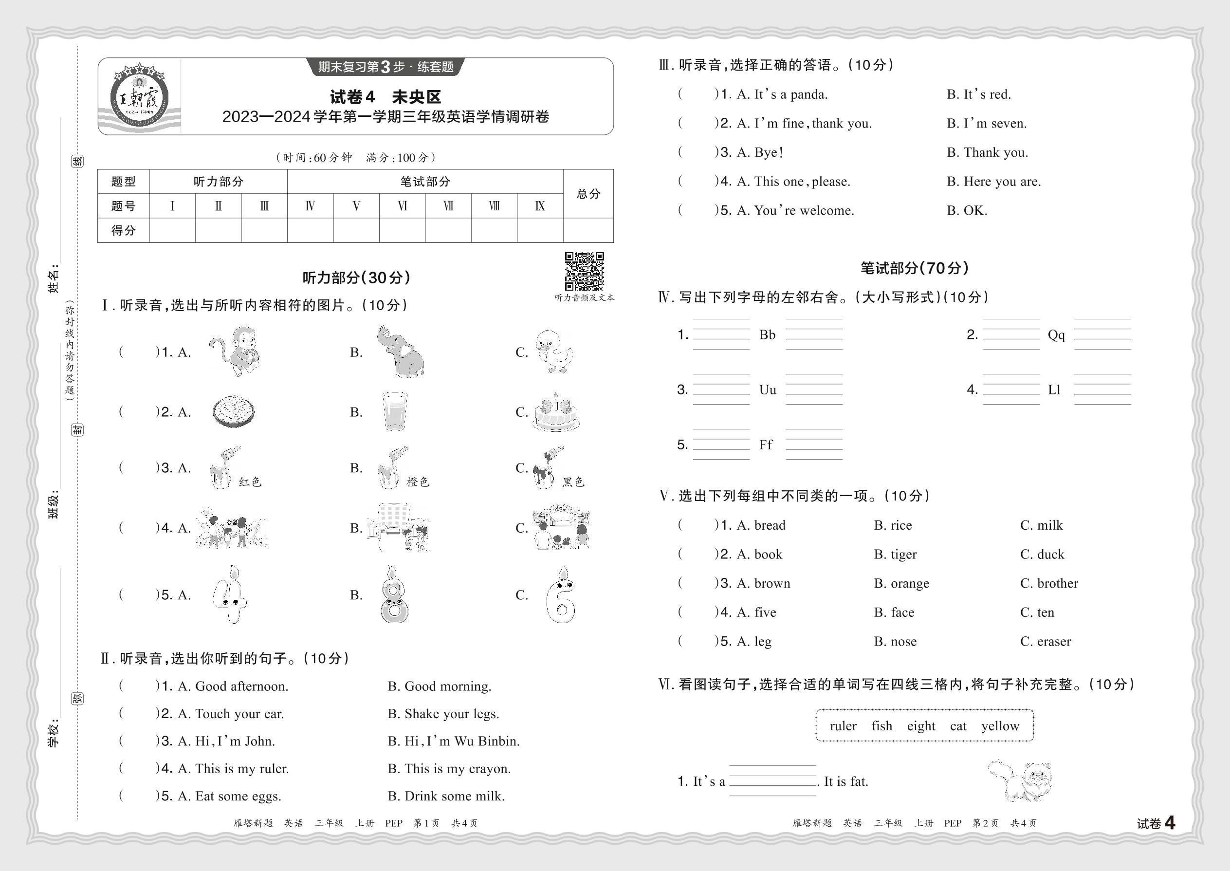 陕西省西安市未央区2023—2024学年第一学期三年级英语学情调研卷(PEP版)【4】