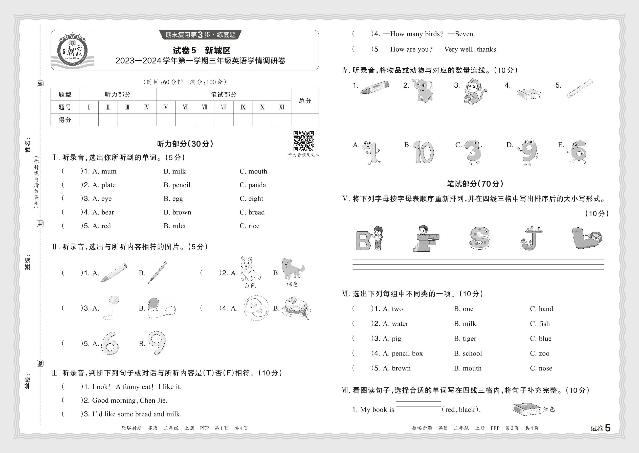 陕西省西安市新城区2023—2024学年第一学期三年级英语学情调研卷(PEP版)【5】