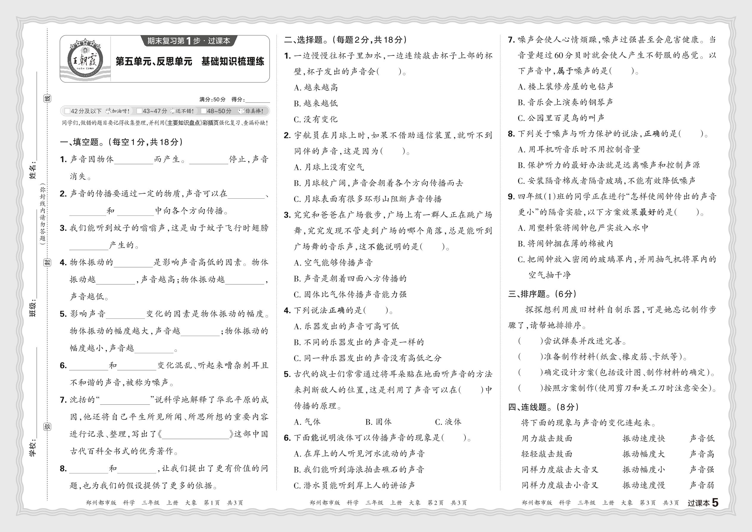 2023秋上册三年级科学大象版 期末过课本·第五单元、反思单元 基础知识梳理练【5】