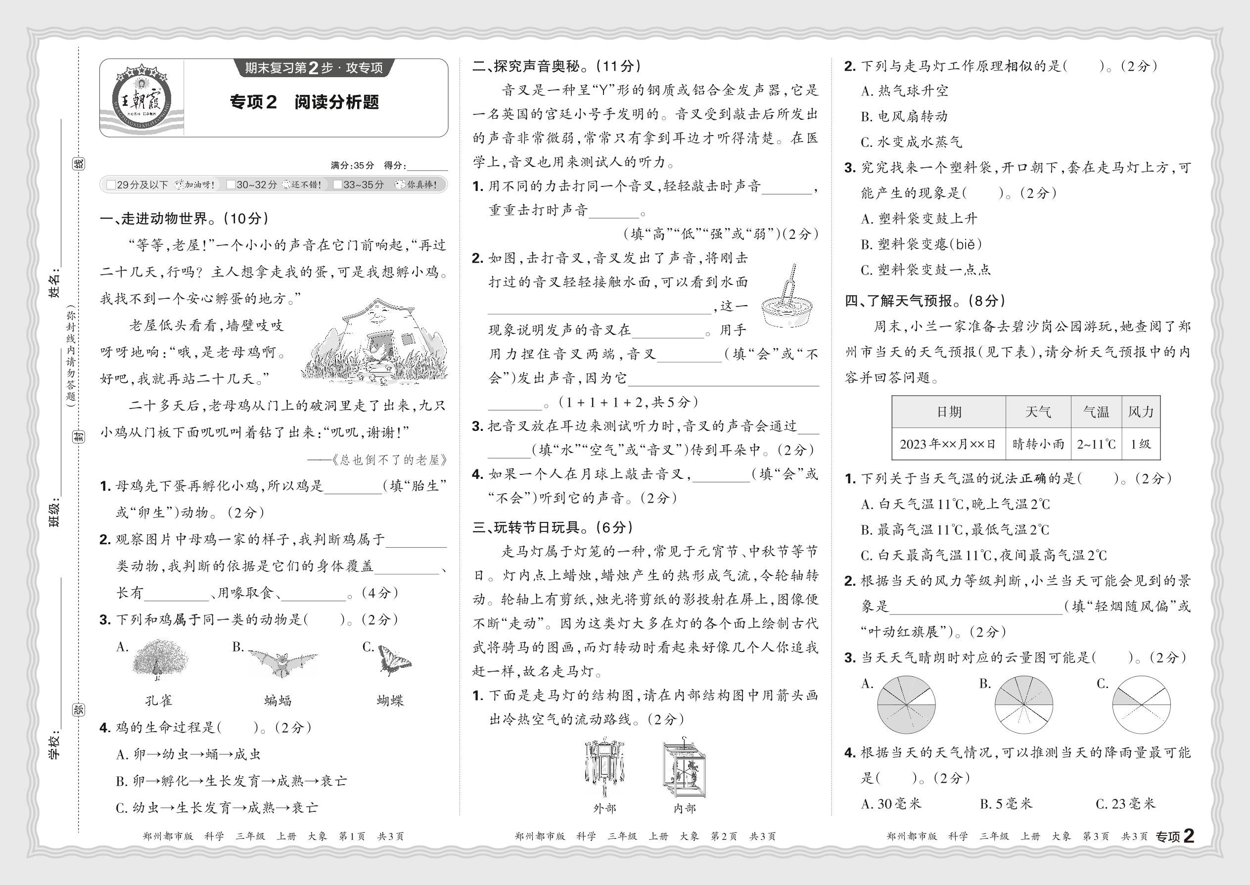 2023秋上册三年级科学大象版 期末专项卷·阅读分析题【2】