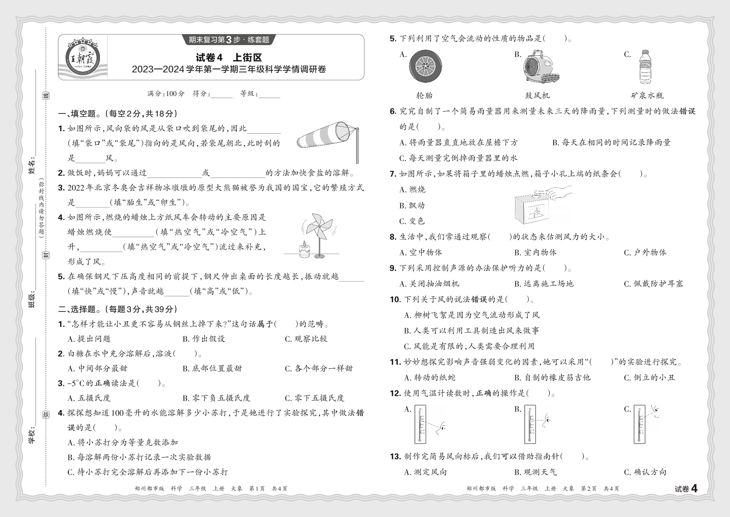 河南省郑州市上街区2023—2024学年第一学期三年级科学学期调研卷(大象版)【4】