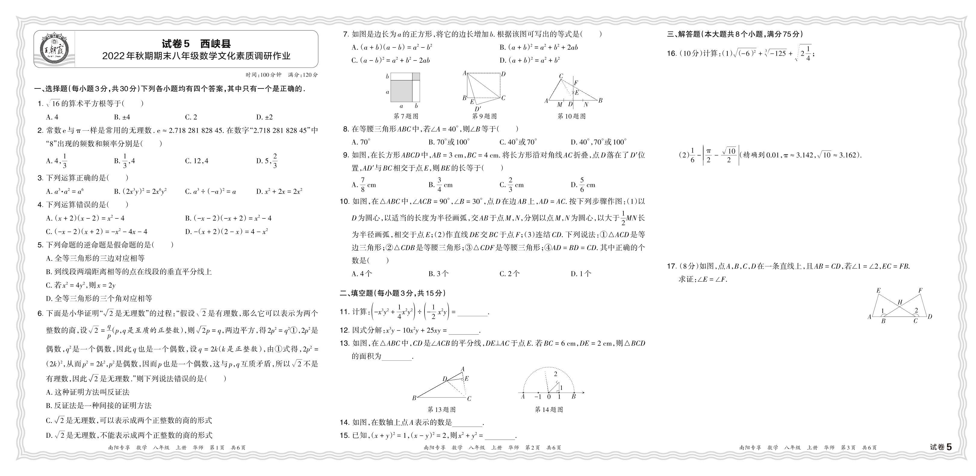 河南省南阳市西峡县2022年秋期期末八年级数学文化素质调研作业(华师版)【5】