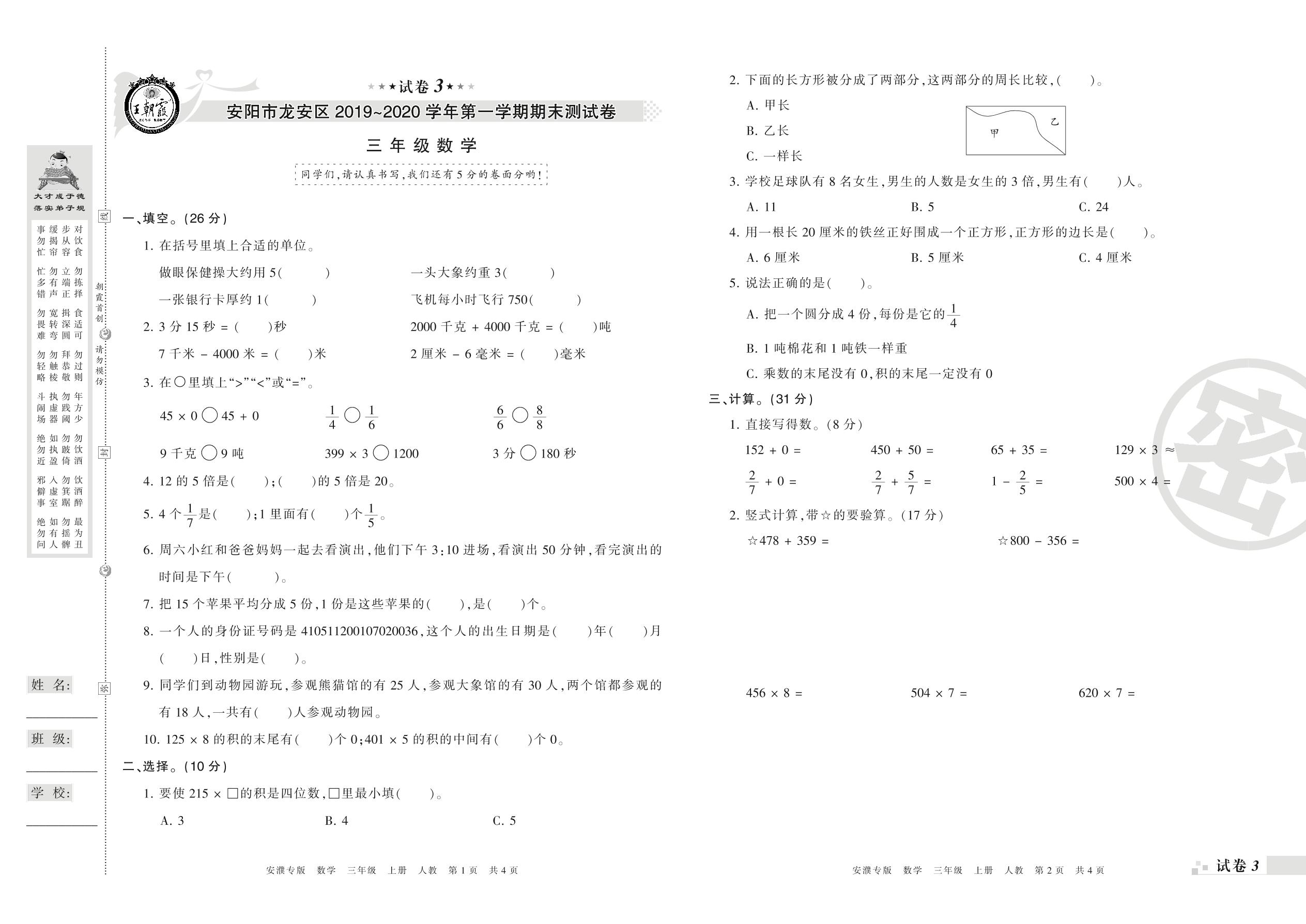 2019-2020学年第一学期安阳市龙安区三年级数学试卷(人教版)【3】