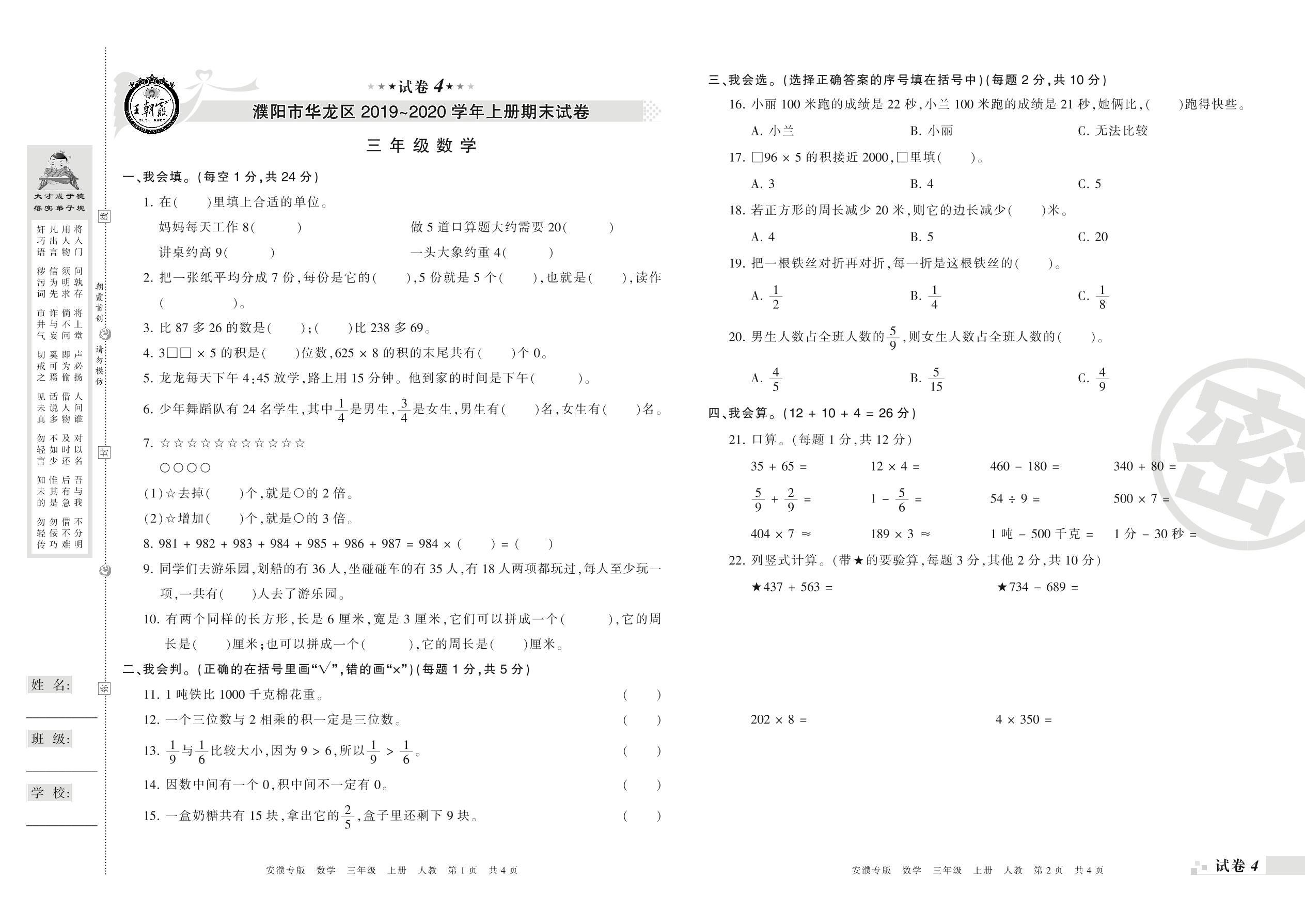 2019-2020学年第一学期濮阳市华龙区三年级数学试卷(人教版)【4】