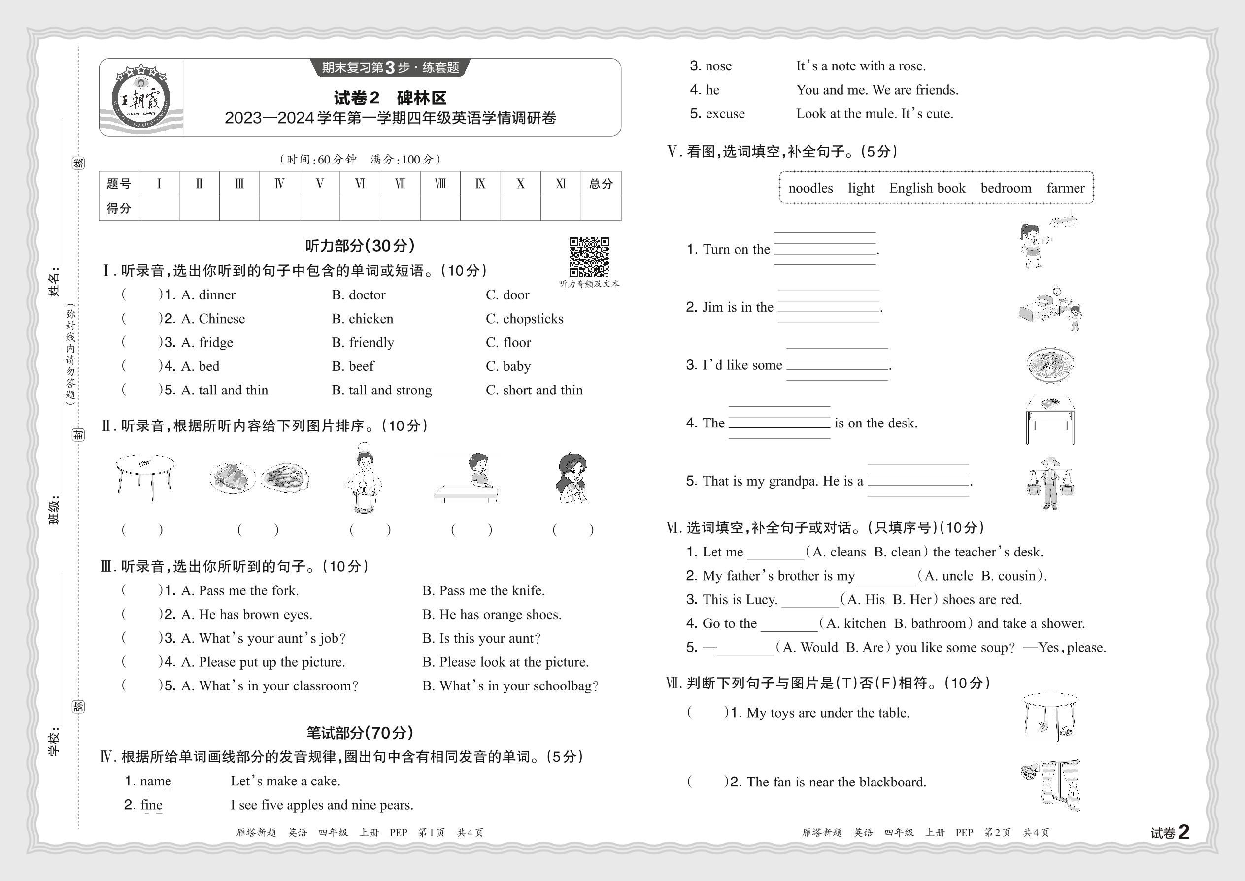 陕西省西安市碑林区2023—2024学年第一学期四年级英语学情调研卷(PEP版)【2】