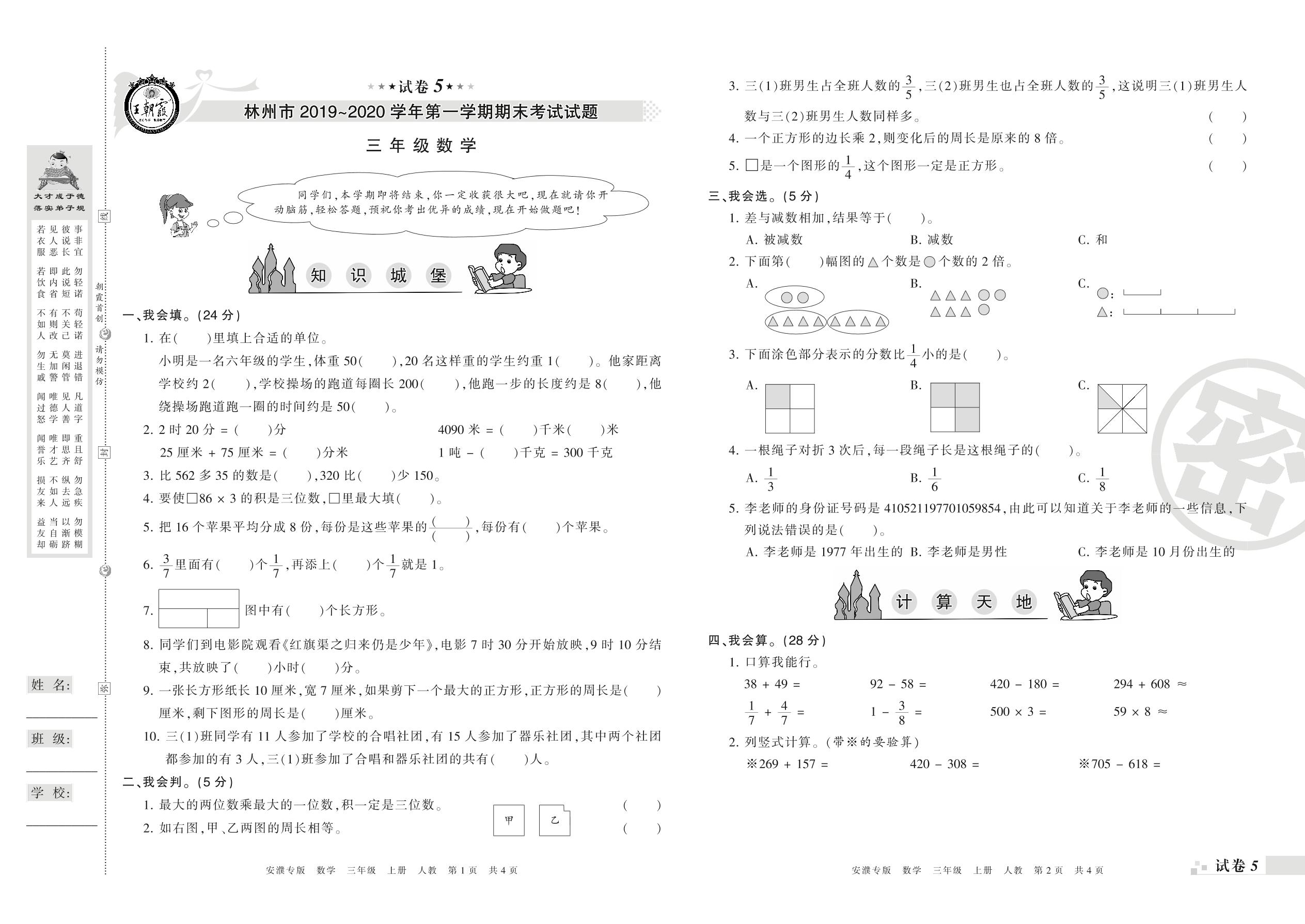 2019-2020学年第一学期林州市三年级数学试卷(人教版)【5】