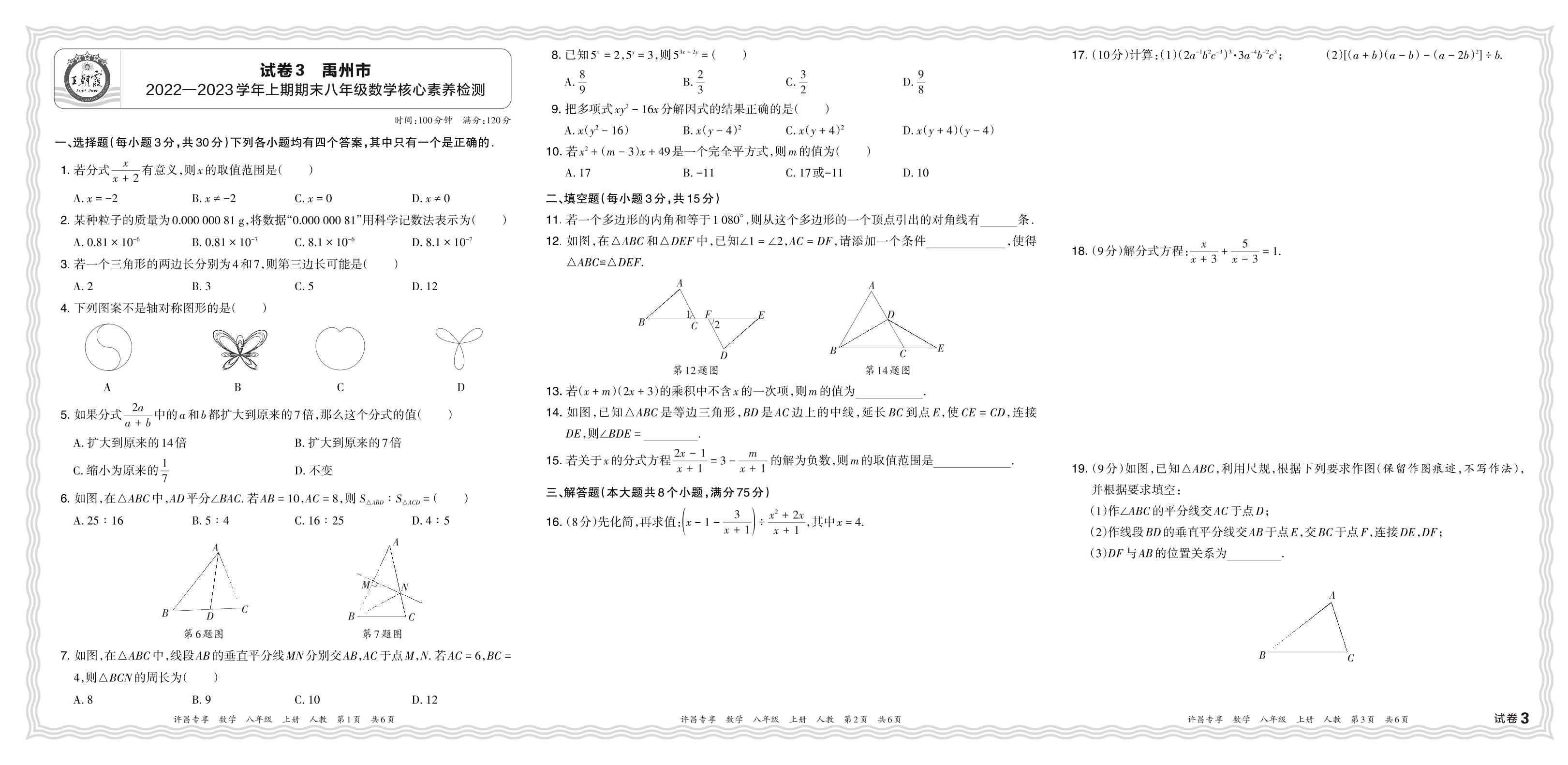 河南省许昌市禹州市2022—2023学年上期期末八年级数学核心素养检测(人教版)【3】